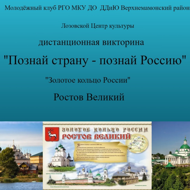 Дорогие друзья, в период с 07 по 11 июля наш Молодежный клуб РГО организовал проведение интеллектуальной викторины «ПОЗНАЙ СТРАНУ – ПОЗНАЙ РОССИЮ. ЗОЛОТОЕ КОЛЬЦО РОССИИ. РОСТОВ ВЕЛИКИЙ». Мы...