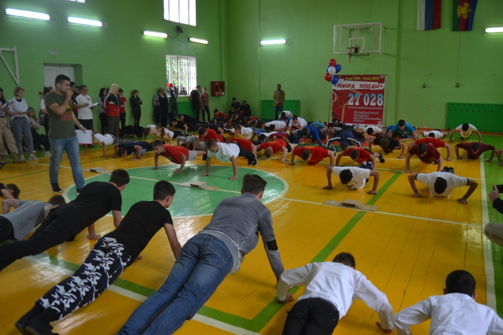 Десятки парней и девушек – школьники, студенты, волонтёры на спортивной площадке Апшеронского лесхоз-техникума выполнили отжимания в упоре по одному разу за каждый прожитый мирный день с момента окончания Великой Отечественной войны. В общей сложности участники совершили 27028 отжиманий.