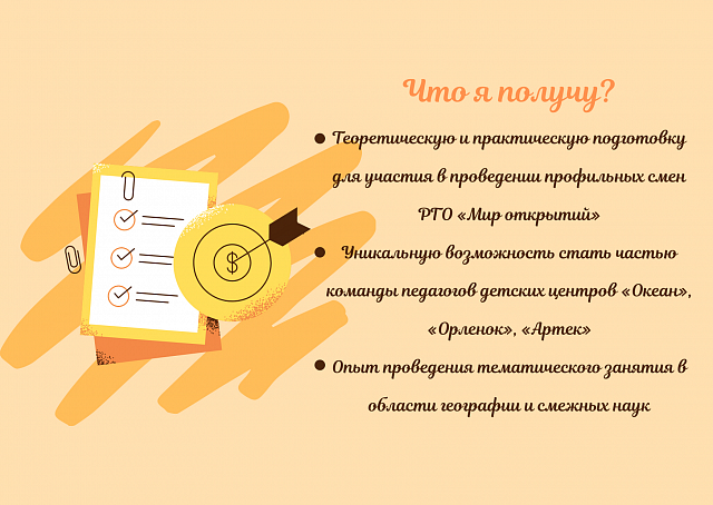 Русское географическое общество объявляет конкурс на участие в стажировке в рамках проведения профильных смен Русского географического общества "Мир открытий". Участники программы пройдут подготовку и смогут преподавать в одном из детских центров — "Океан", "Орлёнок" или "Артек".