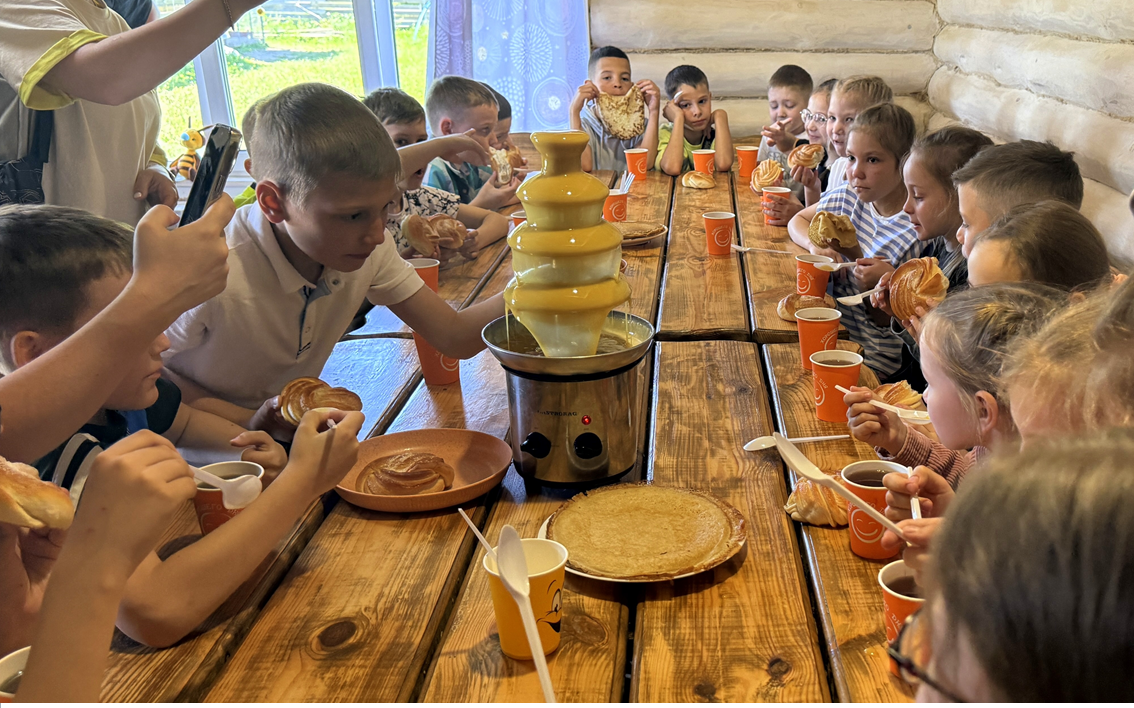 Далее последовал один из самых сладких моментов программы – чаепитие с медовым фонтаном. Ароматные булочки, воздушные блины и струящийся из фонтана мёд создали поистине волшебную атмосферу.