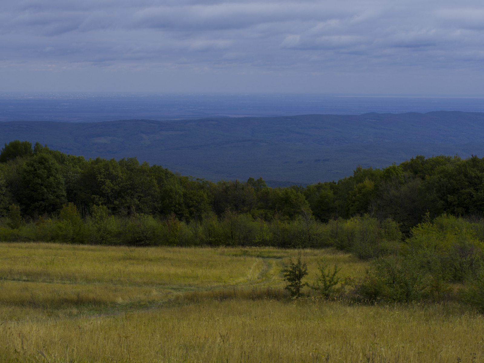 2. В южном направлении с горы Собер Баш открывается вид на предгорья и горы Большого Кавказа. Отсюда виден семиглавый хребет Папай и гора Тхаб, а немного восточнее видны горы Фишт, Оштен и плато Лаго-Наки.