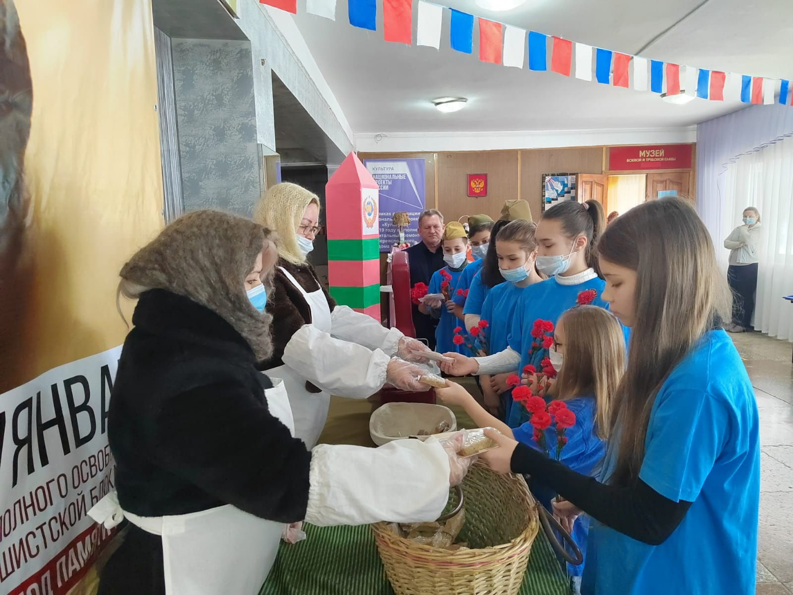 После ребята просмотрели небольшой видеоролик и спустились в фойе дома культуры, где стали непосредственными участниками акции "блокадный хлеб".