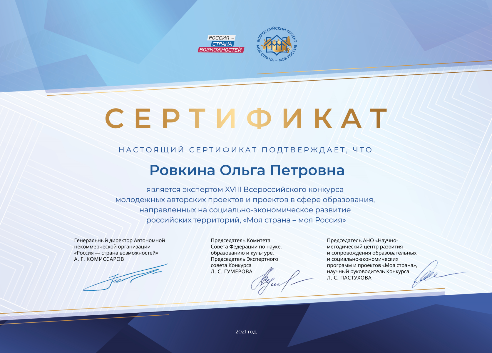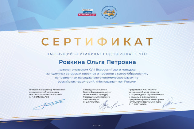 Руководитель Северского Молодежного клуба РГО Ольга Ровкина стала экспертом номинаций "Моя педагогическая инициатива", "Моя гостеприимная Россия", "Моя гордость. Моя малая родина" в рамках всероссийского просветительского проекта "Моя страна — моя Россия".