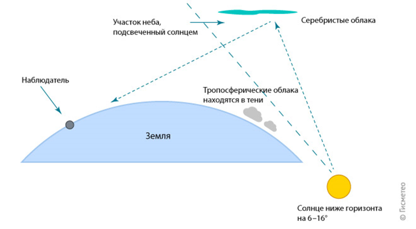 Причина, по который серебристые облака наблюдаются ночью, а не днем, понятна из приведенной схемы. В то время, как наблюдатель находится еще на «ночной территории», серебристые облака попадают в освещенную солнцем зону.