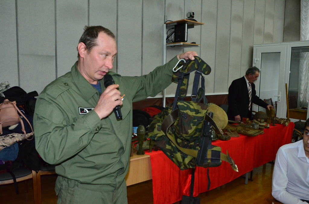 Член поискового отряда, учитель ОБЖ средней школы поселка Терскол, полковник в отставке Магомед Непеев, в свою очередь, рассказал ребятам о найденных элементах оружия, амуниции, личных вещах, принадлежащих советским и немецким солдатам. Особый интерес у юношей и девушек вызвали советская солдатская фляжка с инициалами бойца, кружка с двумя пулевыми отверстиями, немецкая печатная машинка, портативная печка-спиртовка и динамомашина.