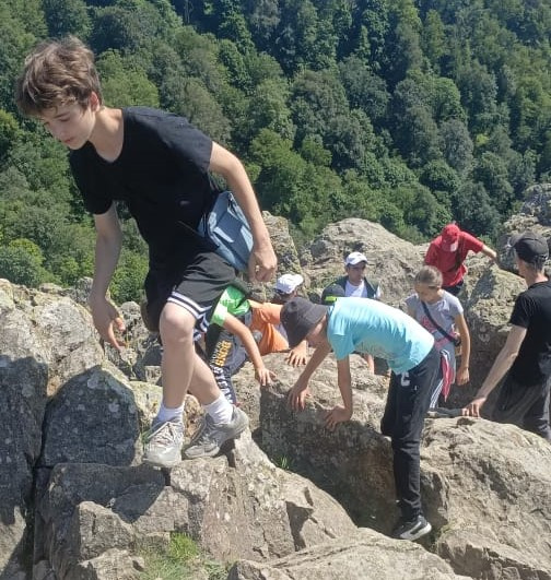 Юные альпинисты прошли по реке Скакуха, поднялись на Индюшку, с которой открылась потрясающая панорама на самые высокие вершины: Фишт, Оштен и Пшеха-Су. Затем, вдоволь налюбовавшись видами, ребята преодолели сложный подъем на вершину горы Индюк.