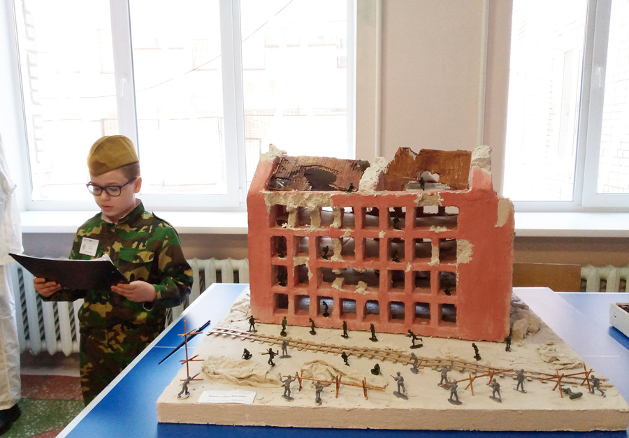 4 кадетский класс представил проект "Дом Павлова г.Сталинград". Коллективную работу учеников, родителей и учителя защищал Каримов Артём. Он рассказал о подвиге наших солдат, ответил на вопросы, объяснил из чего и как создавался макет.