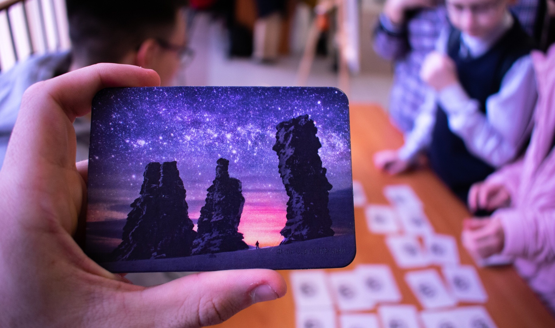 Интерес у школьников был и к играм "Мемори" по мотивам фотоконкурса РГО "Самая красивая страна". Если у участников игры возникали трудности, то им помогали волонтёры, которые рассказывали ребятам про Ленские столбы, Байкальскую нерпу и другие известные достопримечательности нашей страны.