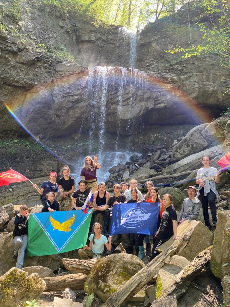 Через 10 минут подходим к Жемчужине г.Хадыженска, Травалевским водопадам. Водопад находится на высоте примерно 700 м. над уровнем моря. Он состоит их двух ступеней, сформированных огромными плитами известняка, по которым каскадом стекают потоки воды. Поднимающиеся вокруг скалы образуют небольшой амфитеатр, сжимая струи воды в шумящий поток, сбегающий по каменистым порогами. Высота водопада составляет около 25м. Водопад Хадыженский живописен, особенно в полноводные периоды. Гроты, скальные обнажения, высокое разнообразие древесных видов растений представляют интерес для любителей редких растений. Особенно красив водопад в мае, в период цветения чубушника, покрывающего его склоны. В разное время года различное количество воды срывается со скальных массивов. Иногда это ревучий поток, иногда небольшие струйки, а в сильные морозы – это потрясающий ледяной столб. Здесь много вечнозеленых кустарников, падуба и лавровишни. Здесь делаем большой привал. Чтим память погибших минутой молчания. Поем военные песни у костра, проводим экологический десант по уборке мусора у водопада, утилизируем мусор и возвращаемся назад.