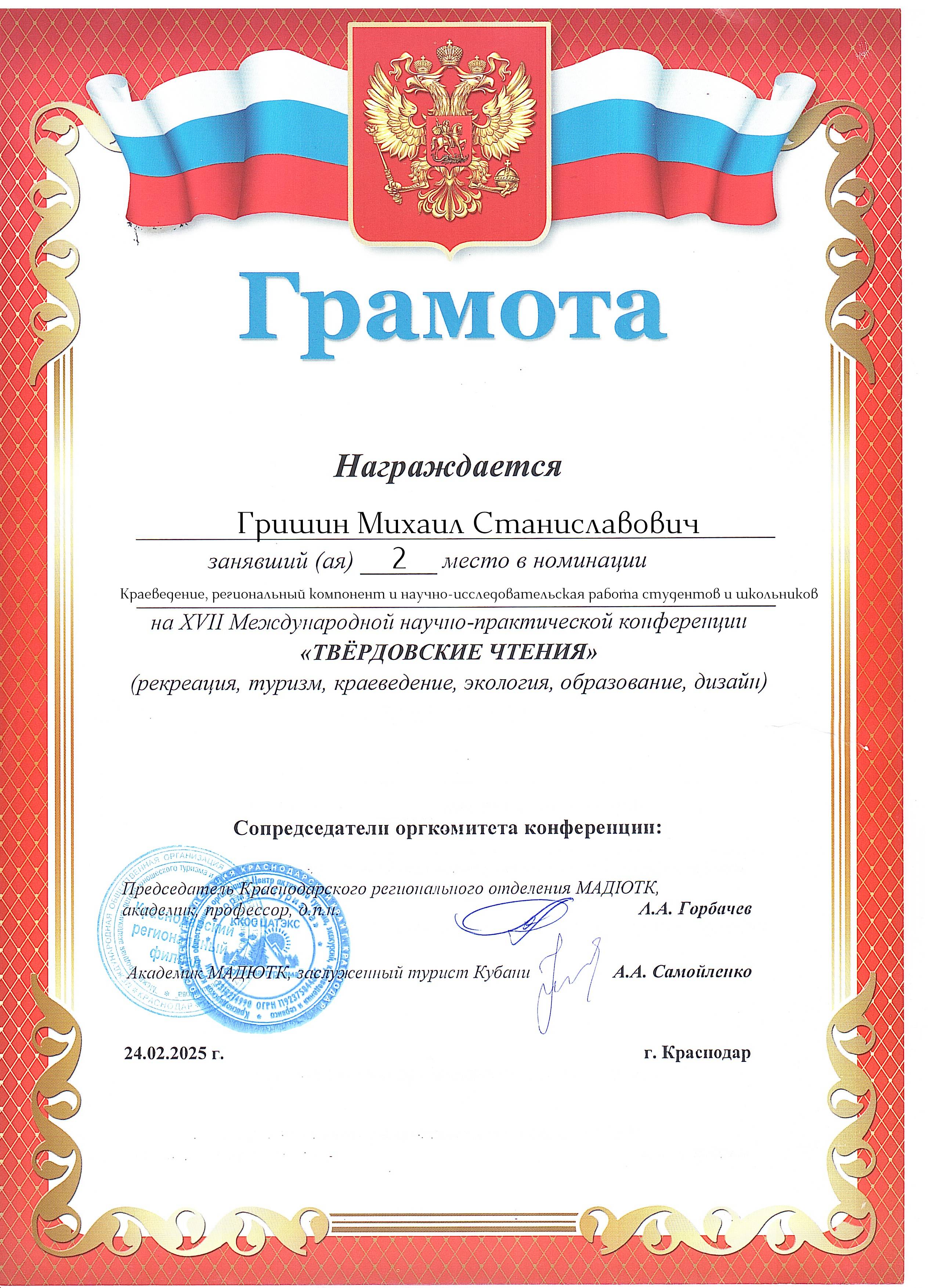 По итогам мероприятия сопредседатель конференции – председатель Краснодарского отделения Международной академии детско-юношеского туризма и краеведения, доктор педагогических наук, профессор Александр Александрович Горбачев и координатор конференции, руководитель комиссии краеведения КРО РГО, генеральный директор Центра активного туризма, экскурсий, краеведения и сервиса, заслуженный турист Кубани Александр Анатольевич Самойленко вручили присутствующим сертификаты, дипломы и грамоты за активное участие в подготовке и проведении мероприятия.