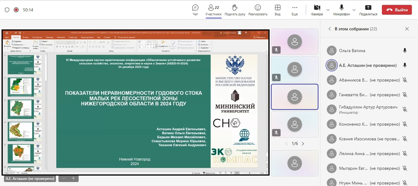 24 декабря 2024 года в онлайн формате состоялась IV Международная научно-практическая конференция «Обеспечение устойчивого развития: сельское хозяйство, экология, энергетика и науки о Земле» (AEES-IV-2024). Члены Молодежного центра РГО Нижегородской области представили 2 доклада.
