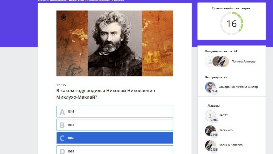 Исполнительная дирекция РГО и Молодёжный клуб РГО на базе Подгоренского лицея имени Н.А. Белозорова провели интеллектуальную онлайн-викторину «Дорогами Миклухо-Маклая». Больше 40 участников проверили свои знания и узнали, насколько хорошо они знакомы с биографией великого русского антрополога, этнографа и путешественника, члена Императорского Русского географического общества Николая Николаевича Миклухо-Маклая, со дня рождения которого 17 июля исполнилось 175 лет.