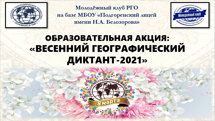 8 марта, в честь Международного женского дня Исполнительная дирекция РГО и Молодёжный клуб на базе Подгоренского лицея имени Н.А.Белозорова организовали проведение образовательно-просветительской акции «Весенний географический диктант».