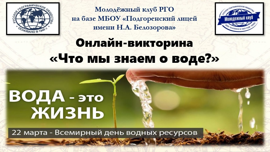 В канун Международного Дня водных ресурсов, который ежегодно отмечается во многих странах мира 22 марта в целях привлечения внимания общественности к чрезвычайной важности водных ресурсов для окружающей среды и развития общества, Молодёжным клубом РГО на базе Подгоренского лицея имени Н.А.Белозорова в Воронежской области был проведён цикл мероприятий, приуроченных к этой всемирной эколого-географической дате.
