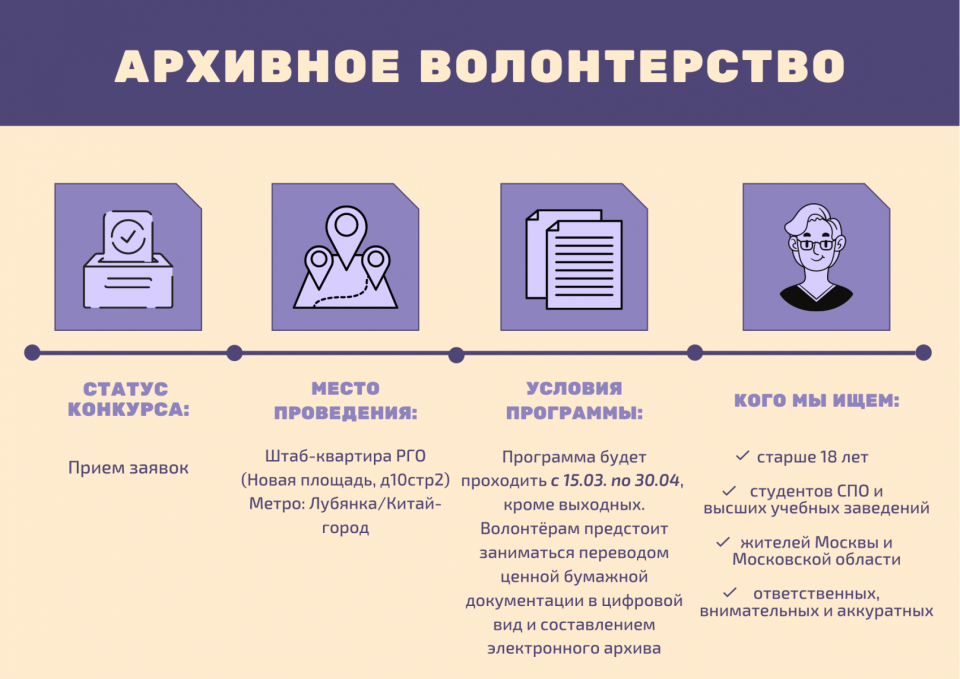Русское географическое общество приглашает добровольцев принять участие в волонтёрской программе Исполнительной дирекции РГО "Архивное волонтерство". Она пройдёт с 15 марта по 30 апреля в Штаб-квартире Русского географического общества в Москве.