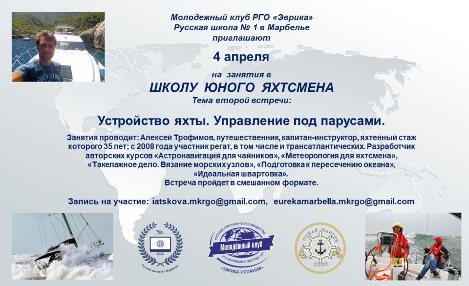 25 марта в Марбелье открыла свои двери «Школа юного яхтсмена», организованная Молодежным клубом РГО «Эврика» на базе Русской школы №1 в Марбелье. Более 20 участников, членов МК РГО, учащихся школы и детей соотечественников, проживающих на побережье, смогли принять очное участие в первом занятии. Ко встрече онлайн подключились и члены других Молодежных клубов РГО.
