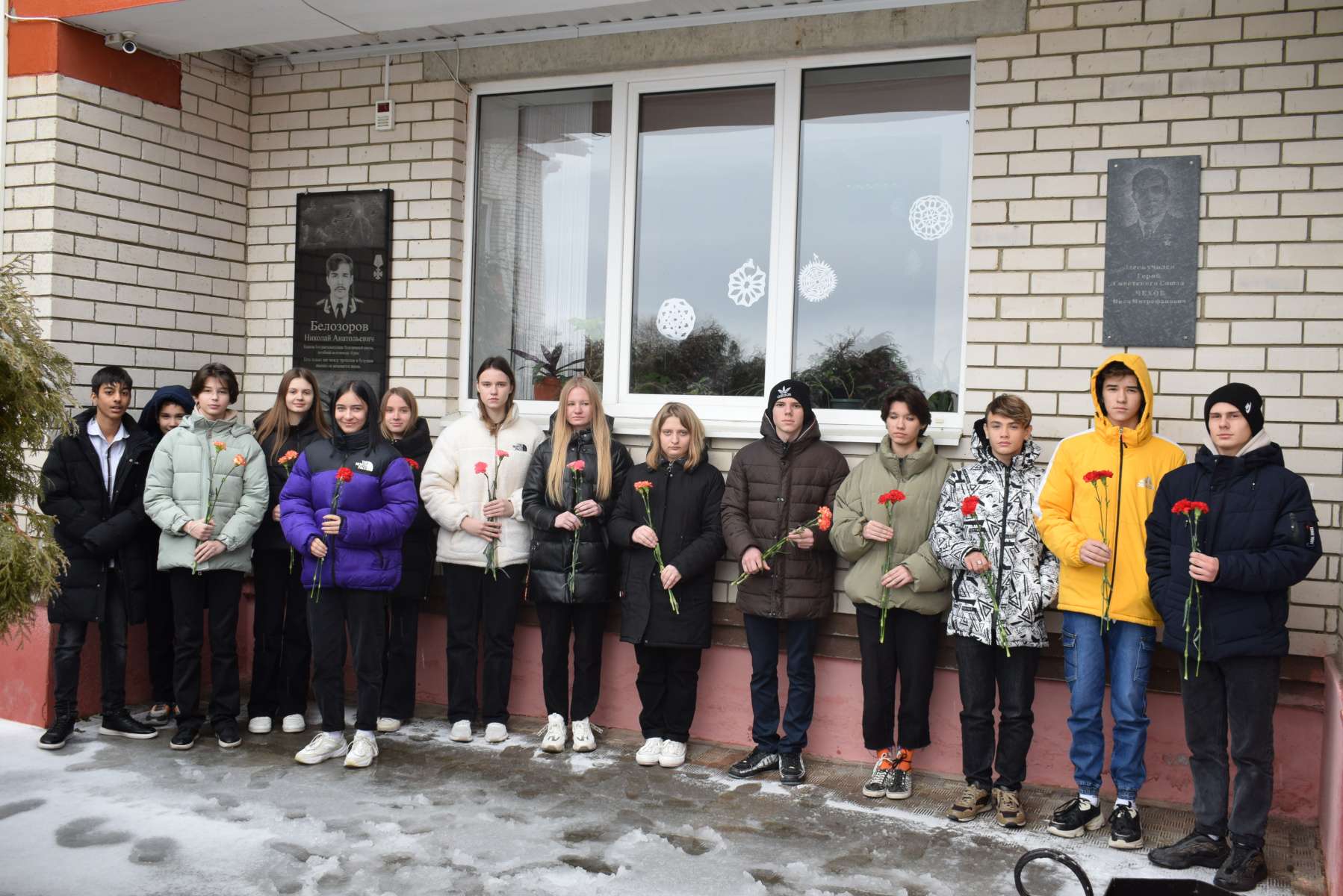 В завершение, по традиции, участники возложили цветы к мемориальным доскам героям-выпускникам школы - Белозорову Н.А. - кавалеру ордена Мужества и Чехову И.М. - Герою Советского Союза.