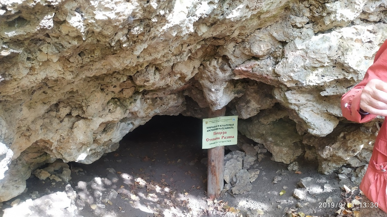 Среди местных жителей распространена легенда о том, что в XVII веке в пещере укрывался Степан Разин со своими людьми. Здесь же они хранили свой клад. Пещера и вход в неё раньше были такими, что в неё въезжали, сидя на конях. Вход в пещеру был прикрыт лесом, поэтому отряд появлялся как бы из-под земли и исчезал внезапно.