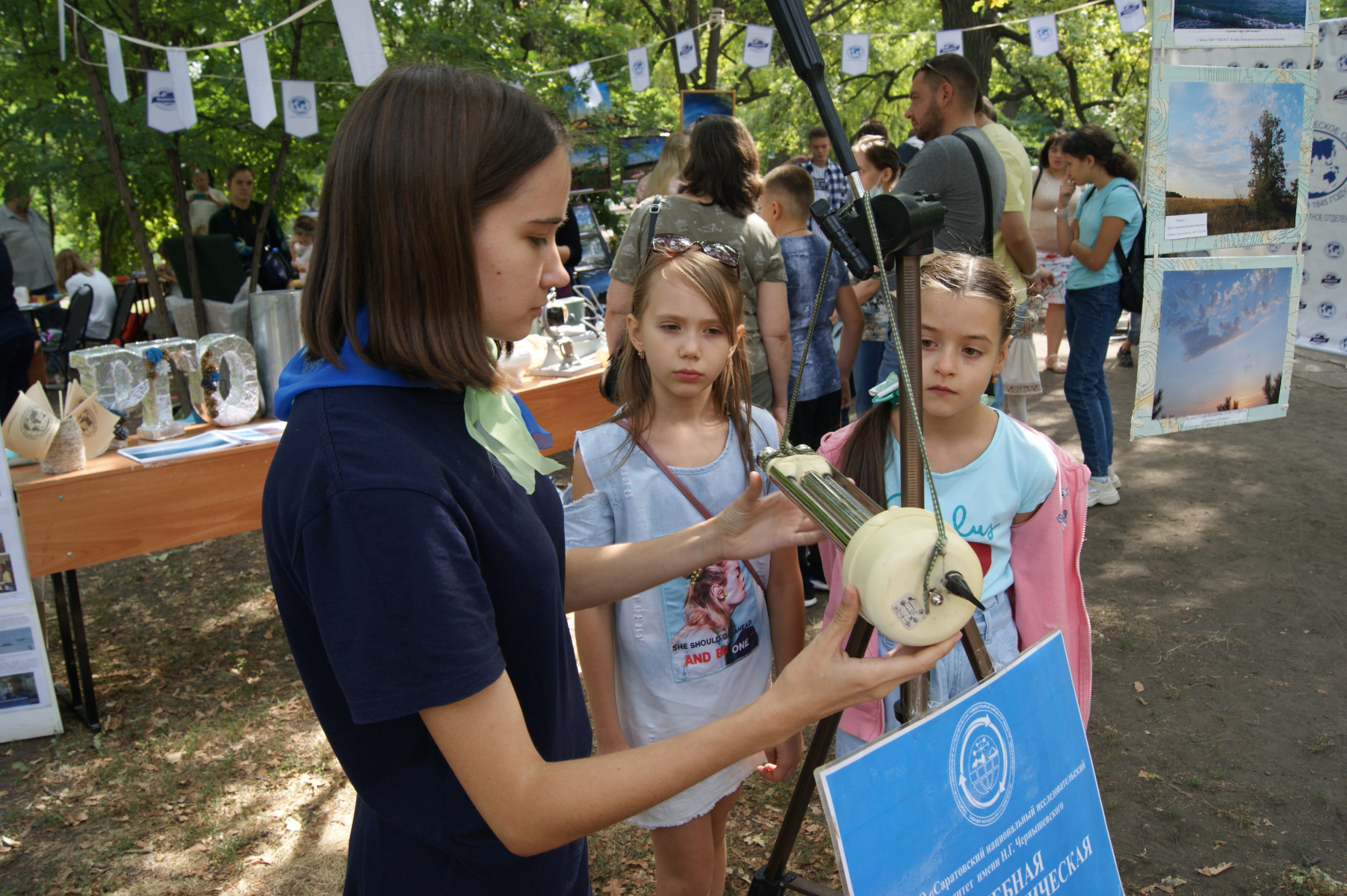 На метеостанции - совместной научно-познавательной площадке Молодежного клуба РГО и научно-образовательного проекта "Метеорологика" - желающим предлагали познакомиться с приборами и оборудованием для метеорологических и аэрологических наблюдений, применяемыми на сети Росгидромета для анализа погодных условий и самостоятельно провести некоторые измерения. В этом году проект поддержан грантом РГО. Студенты кафедры метеорологии и климатологии СГУ осуществляли ежечасный мониторинг погоды в Городском парке: измеряли температуру, относительную влажность и атмосферное давление на площадке.