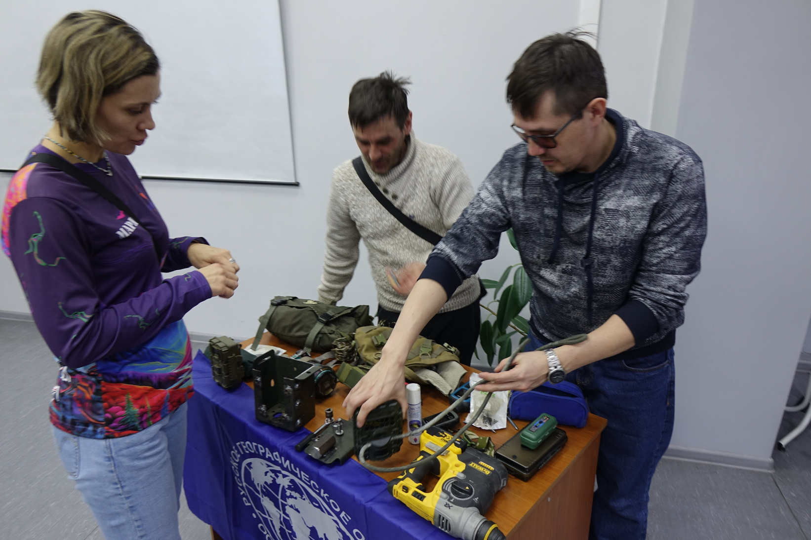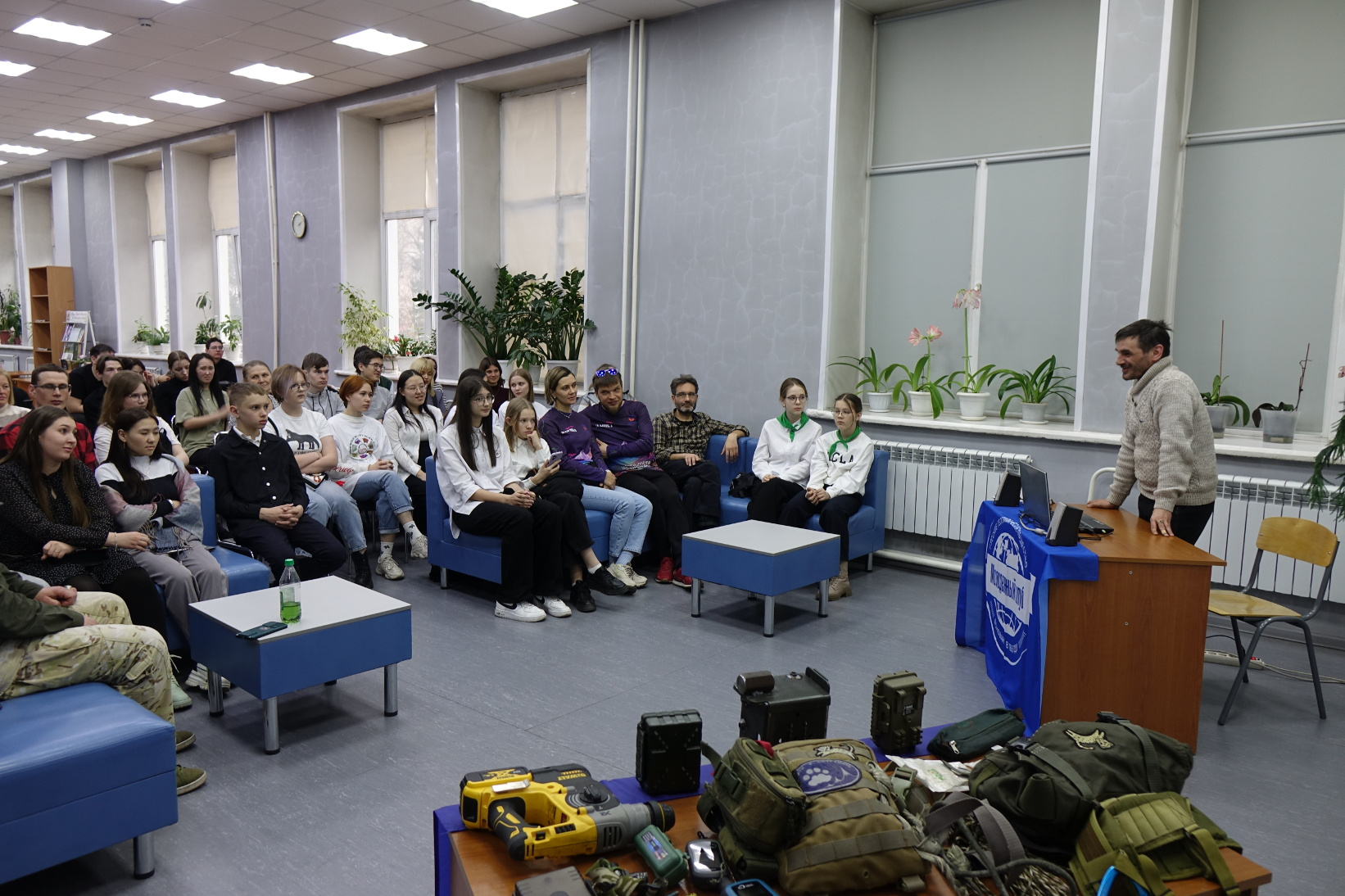 Ещё один герой встречи, младший научный сотрудник заповедника «Хакасский» - Александр Исаев, продемонстрировал экспедиционный рюкзак специалиста, отправляющегося на полевые исследования. У будущих защитников природы была возможность заглянуть внутрь рюкзака и познакомиться с его содержанием и узнать без чего невозможно получить успешные результаты научных работ. Им продемонстрировали принцип действия фотоловушки и основные правила их установки.