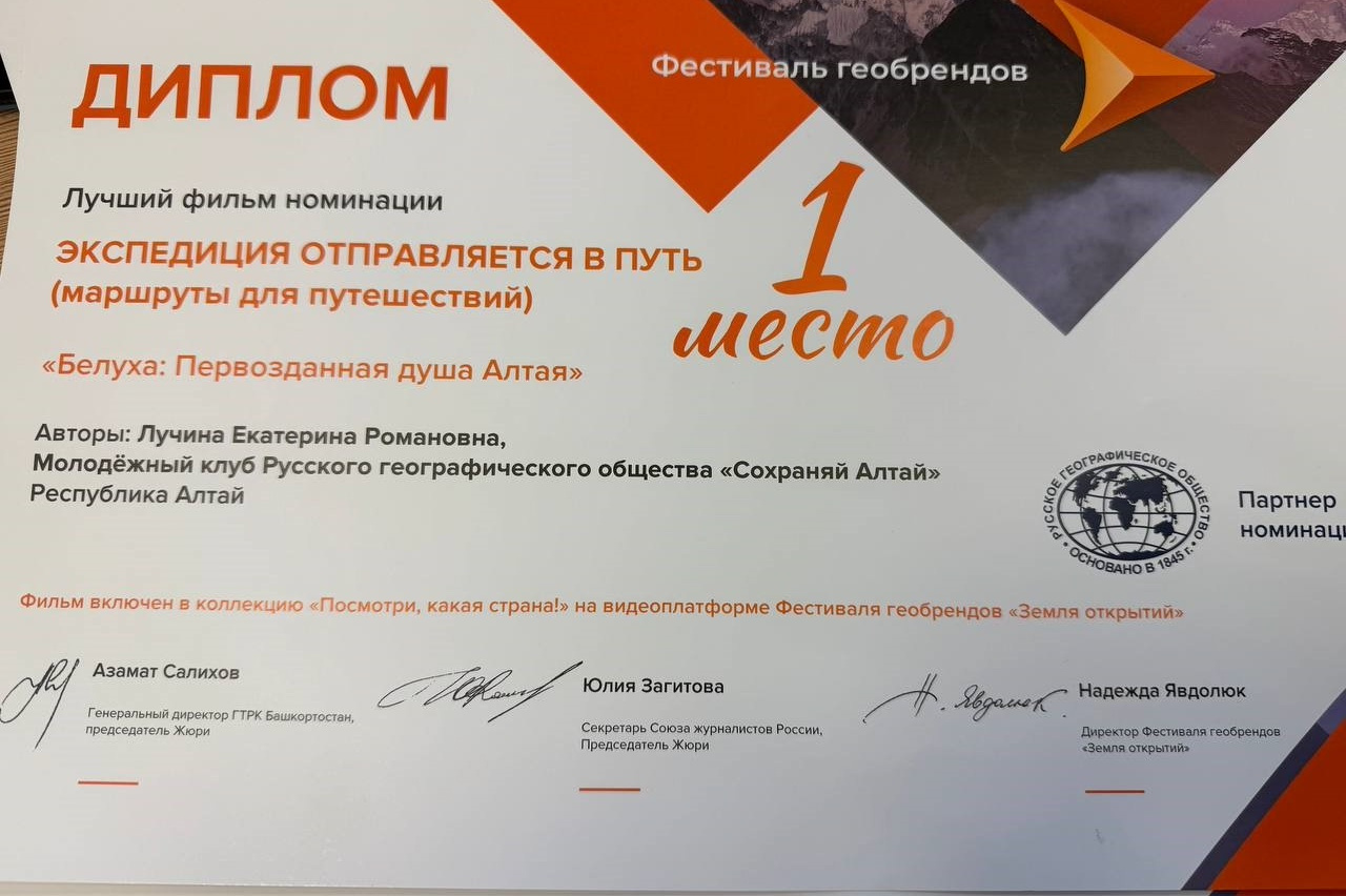 Три фильма, рассказывающих о природе, природоохранных проектах и традициях Республики Алтай попали в шорст-лист конкурса фильмов и видеороликов в рамках Фестиваля геобрендов «Земля открытий». Фильмы созданы в рамках Молодёжного природоохранного проекта «Сохраняй Алтай», организаторами которого являются Молодёжный клуб РГО «Сохраняй Алтай» и Молодёжный центр РГО в Республике Алтай.