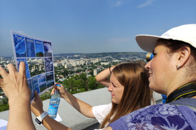 Интересные задания ждали ребят на каждой точке маршрута. Например, у мемориального комплекса "Журавли", используя компас, нужно было определить, куда направлен клин журавлей. На смотровой площадке "Платформа" - определить формы и количество облачности и сфотографировать облака. На площадке "Сигнальное оружие" (с экспозицией самолетной техники) ребят попросили определить, какие виды самолетов предназначены для полетов в сложных метеорологических условиях.