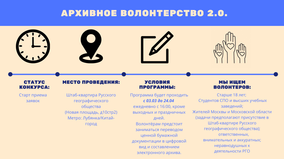 Русское географическое общество приглашает добровольцев принять участие в волонтёрской программе Исполнительной дирекции РГО "Архивное волонтерство 2.0". Она пройдёт с 3 марта по 24 апреля в Штаб-квартире Русского географического общества в Москве.