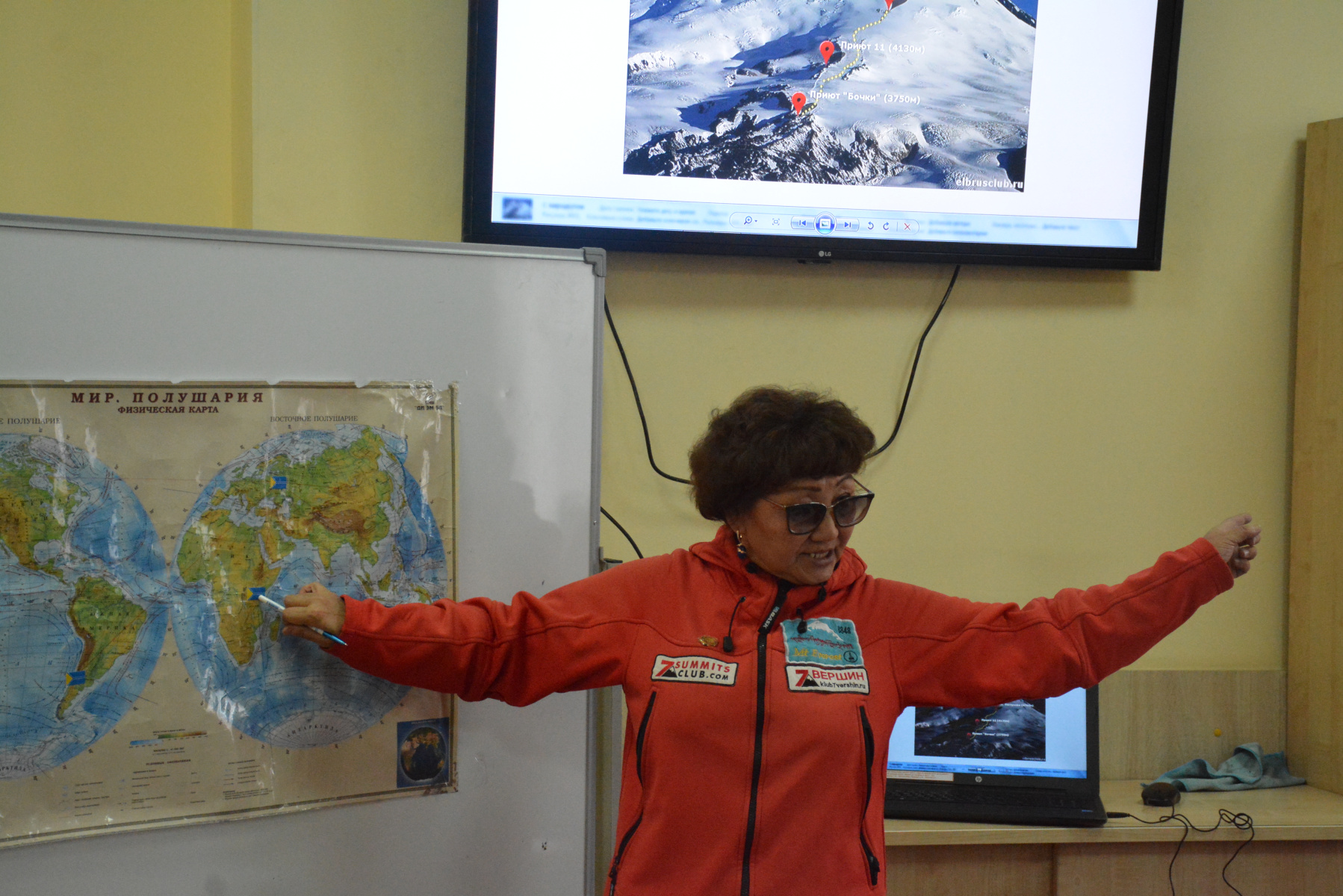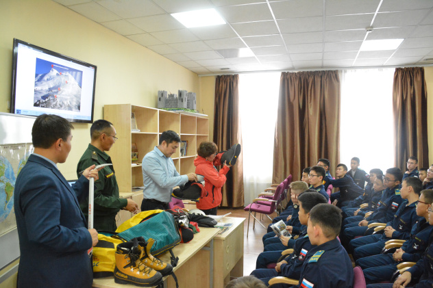 Марианна Кызыл-ооловна, член команды «7 вершин мира - Тува», подробно рассказала о восхождении их команды на пять высочайших вершин – Эльбрус, Килиманджаро, Аконкагуа, Мак-Кинли, пик Костюшко, Эверест (с тибетской стороны 6000 м.). Кадеты с интересом разглядывали тяжелое снаряжение, изучали маршрут восхождений, рассматривали фотографии.