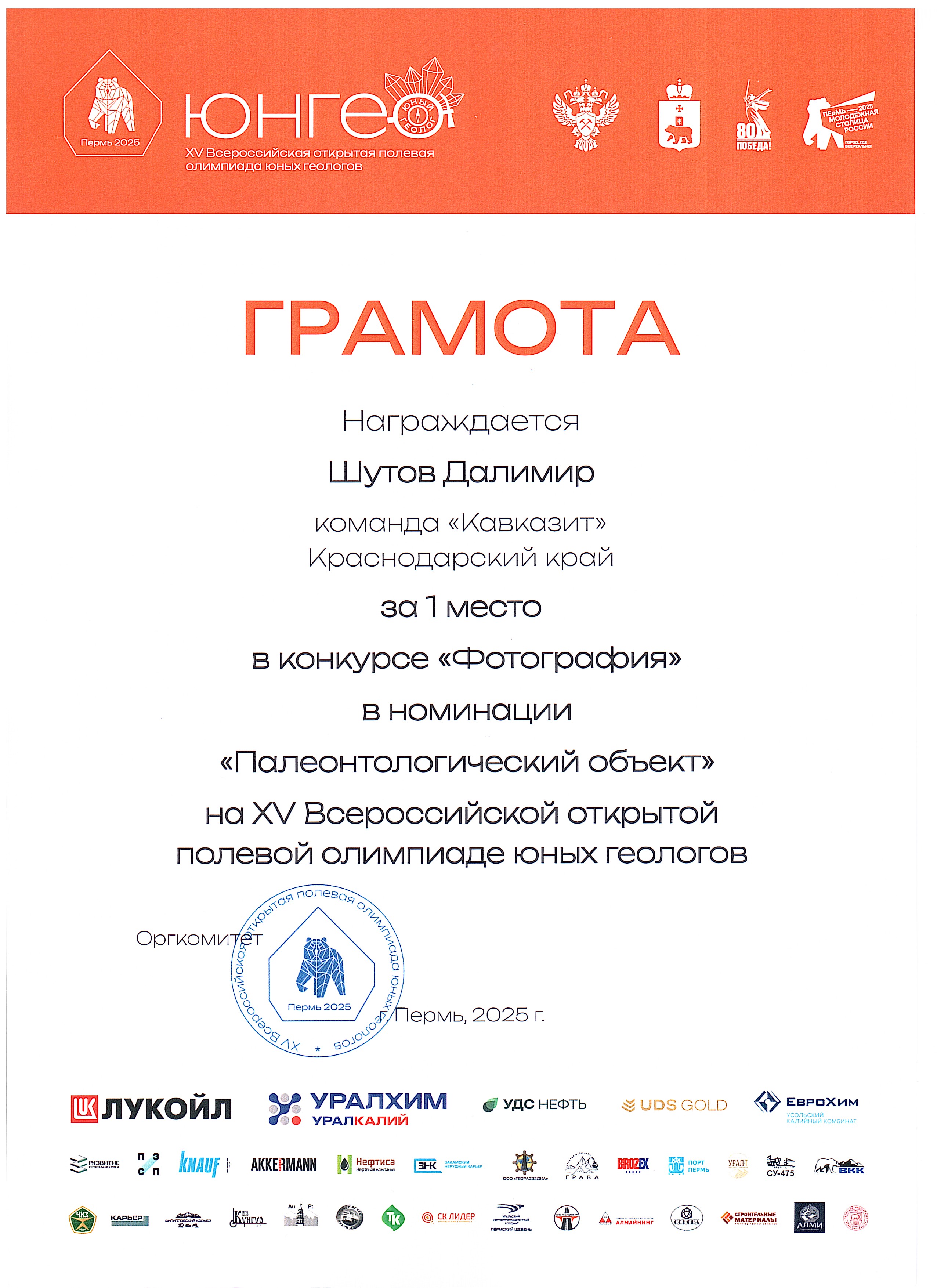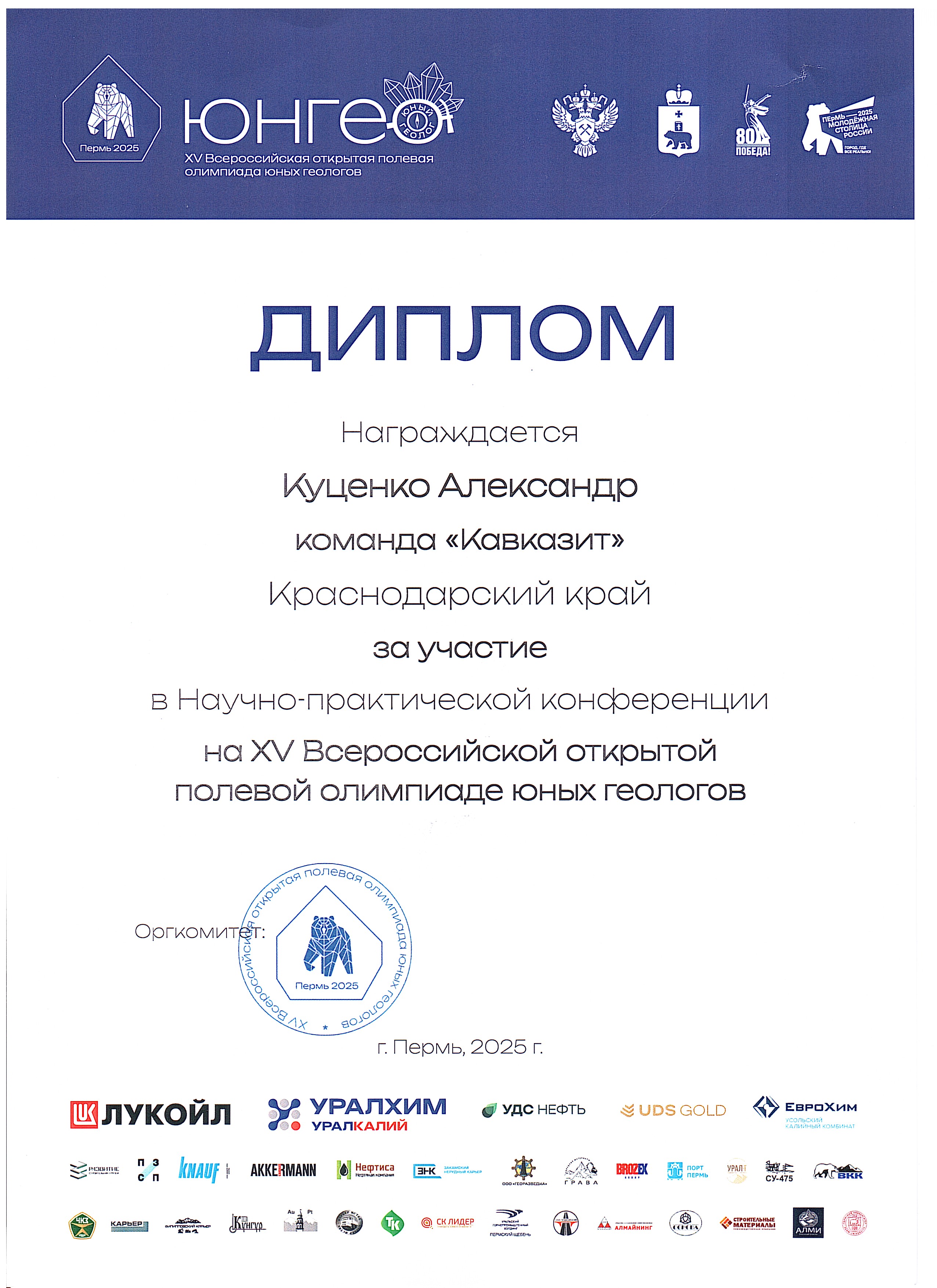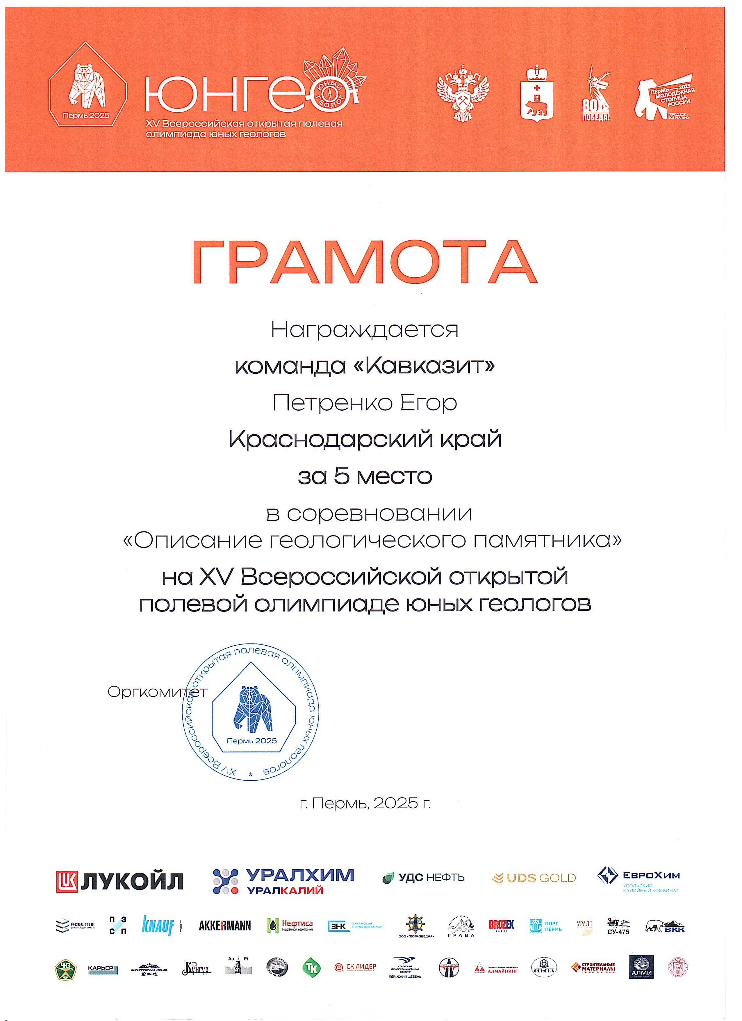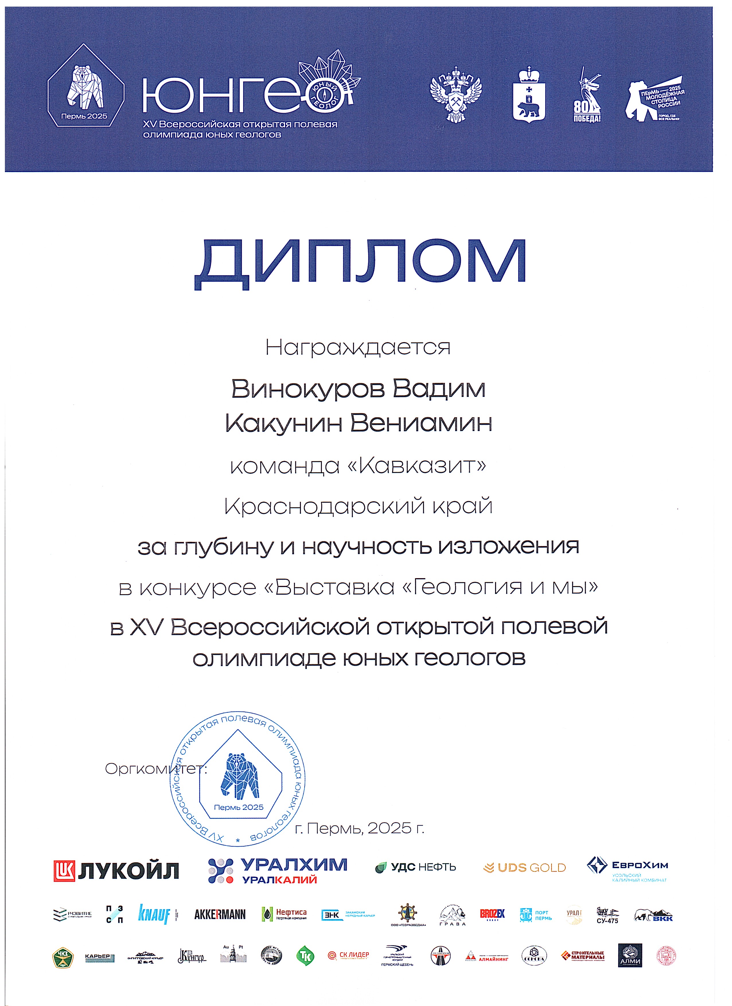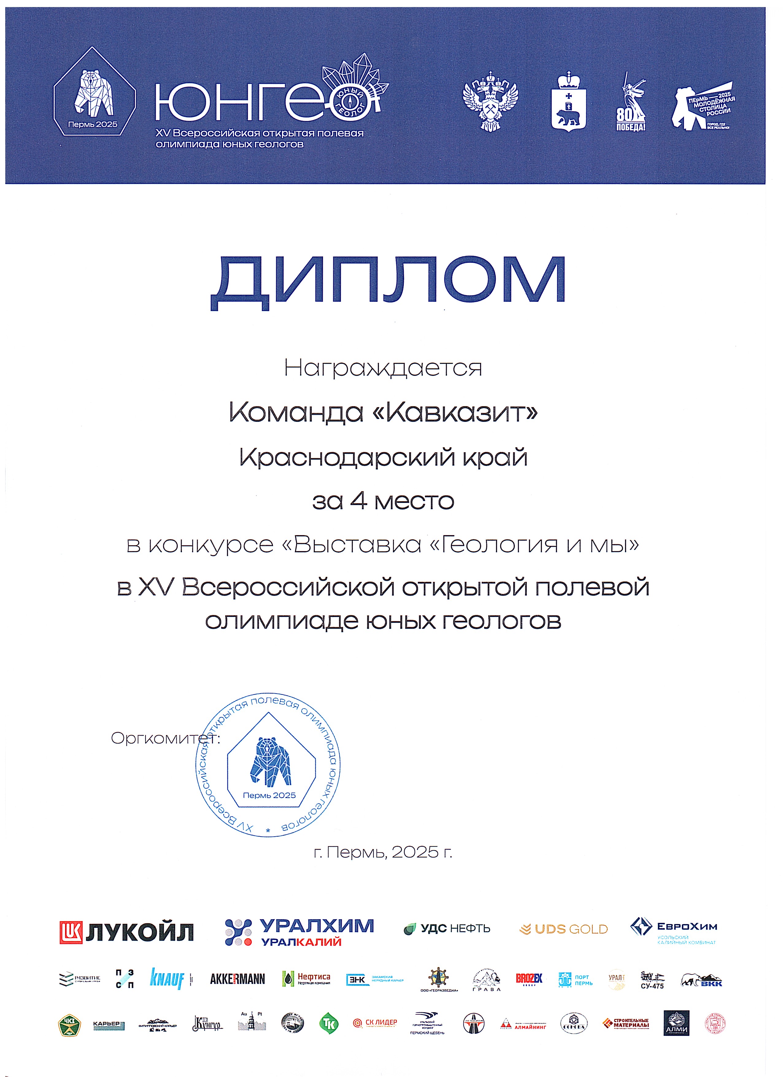 Команда Молодёжного клуба РГО «Академический» «Кавказит» достойно представила Краснодарский край, заняв 15-е общекомандное место на всероссийском уровне. Эта олимпиада стала для наших активистов не просто испытанием знаний, а настоящей школой профессионального роста, возможностью завязать контакты с будущими коллегами и ощутить себя частью большого и важного дела — изучения и сохранения недр нашей Родины. Полученный опыт, новые цели и уверенность в своих силах — главные трофеи, которые ребята привезли из Пермского края. Впереди — новые экспедиции, исследования и победы. Ведь именно так, шаг за шагом, формируется будущее российской геологии.