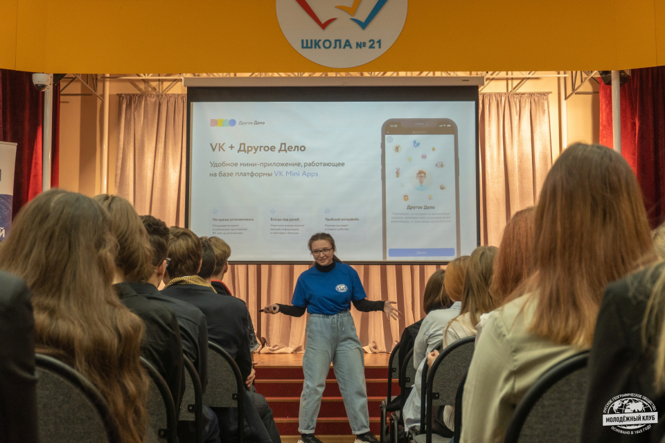 Открыла «День Русского географического общества» Александра Еремеева – студентка 4-го курса Владимирского филиала РАНХиГС, медиаволонтёр Клуба, амбассадор проекта «Другое Дело» президентской платформы «Россия – страна возможностей». Активистка объяснила принцип работы с приложением, поделилась историями успеха своих друзей и предложила заинтересованным слушателям сделать первое задание: написать ожидания от сегодняшнего события. Автора лучшего комментария ждал сувенирный набор РГО.
