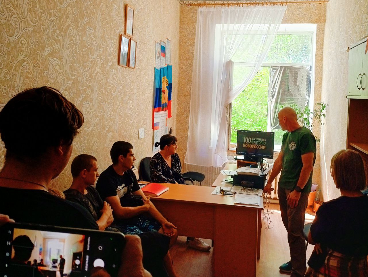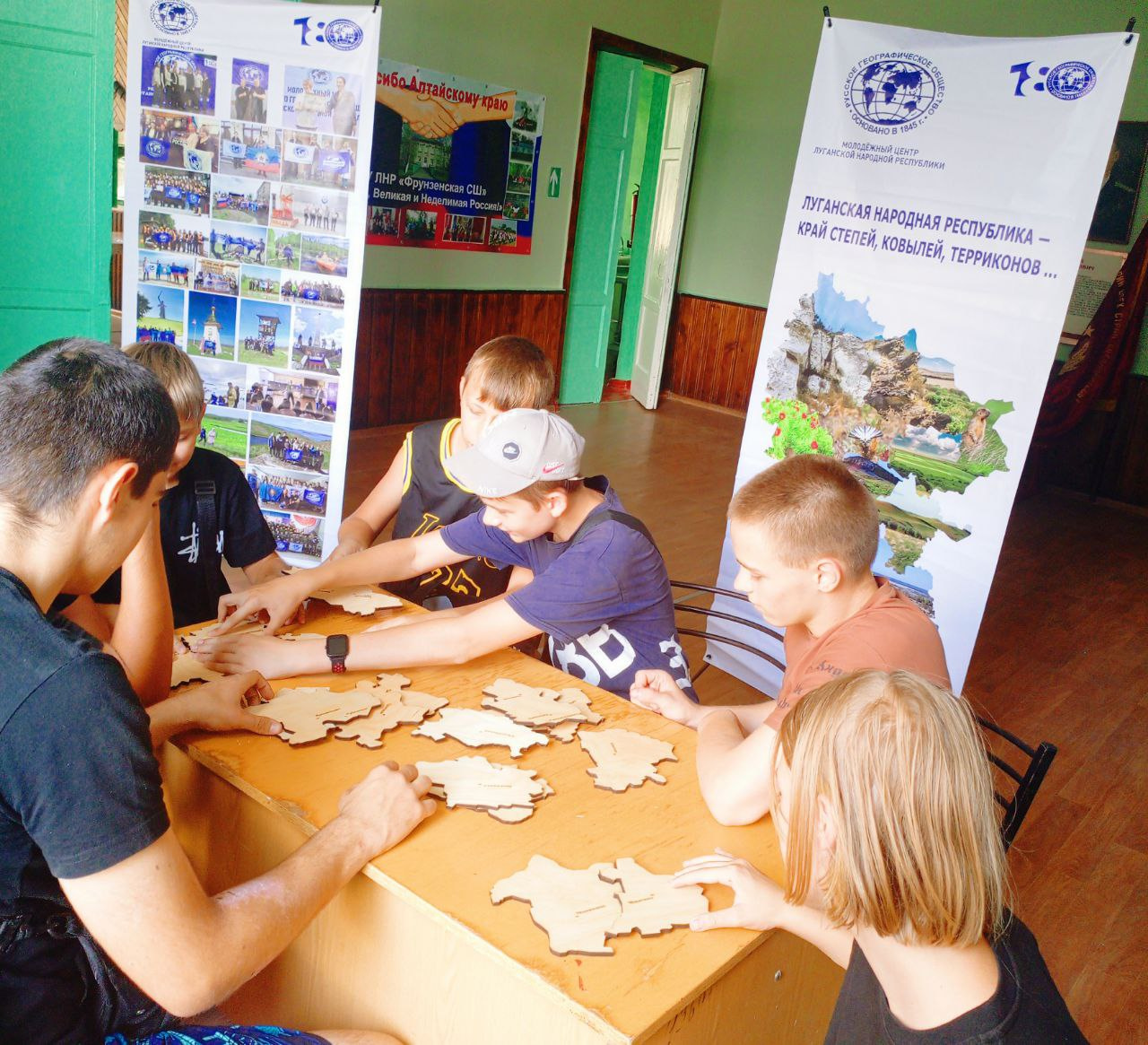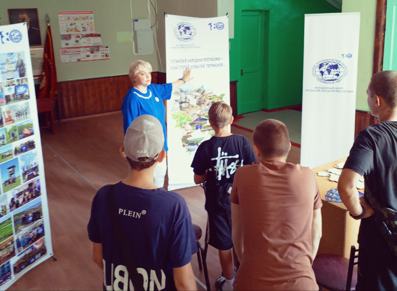 В первый день визита гости посетили среднюю школу в поселке Фрунзе Славяносербского муниципального округа, где состоялась уже в третий раз передача гуманитарной помощи от Центра РГО в Сербии. Поддерживая историческую память о братских регионах, сербские активисты РГО направили для школы необходимое звуковое оборудование, для проведения мероприятий вне школы. Несмотря на летнюю пору, отчаянно палящее Солнце на встречу с гостями пришли ученики 7-9 классов – увлеченные географией. Интерактив с ребятами провела старший преподаватель кафедры географии Института естественных наук Луганского государственного педагогического университета, руководитель молодежного центра РГО ЛНР Юлия Заруцкая. Географическая игра «Уникальная природа Луганщины» с использованием спилс-карты ЛНР вызвала неподдельный интерес у детей, и они живо включились в игру. Вместе посмотрели видео-ролики РГО «100 достоверных фактор о Новороссии» и обсудили увиденное.