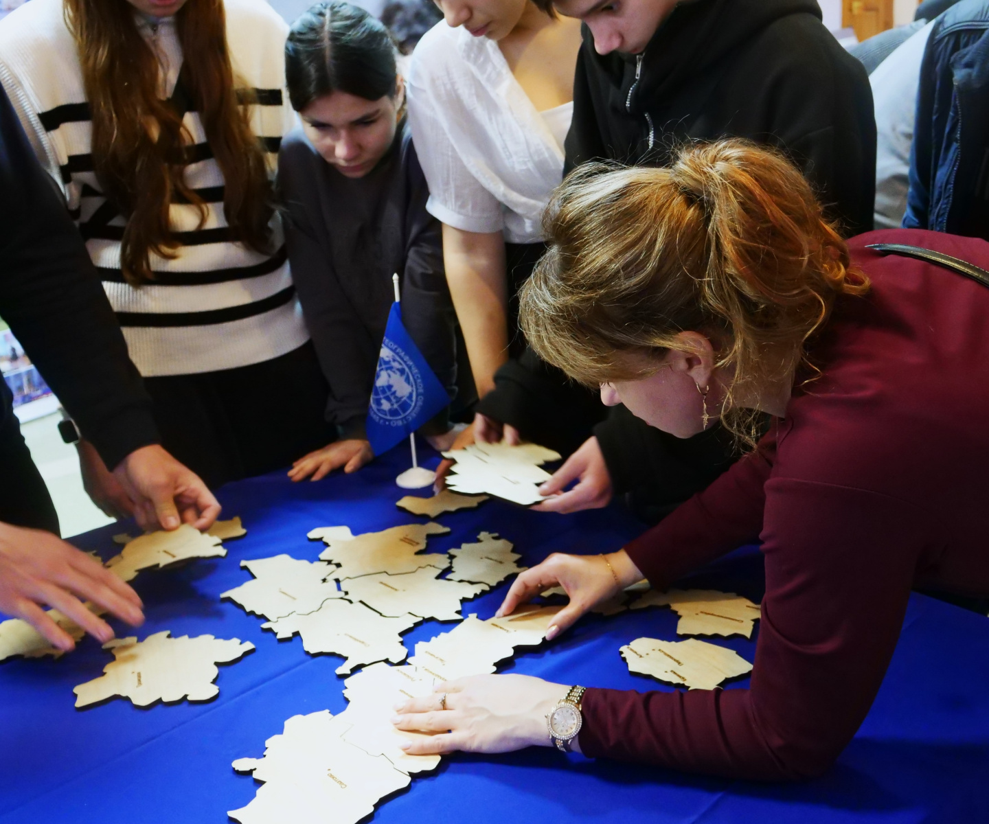 Всех присутствующих гостей РГО в ЛНР встречал красочный баннер и фотозона, интерактивная выставка РГО «30 вопросов по географии России» и чемпионат-соревнование по скоростному складыванию спилс-карт ЛНР.