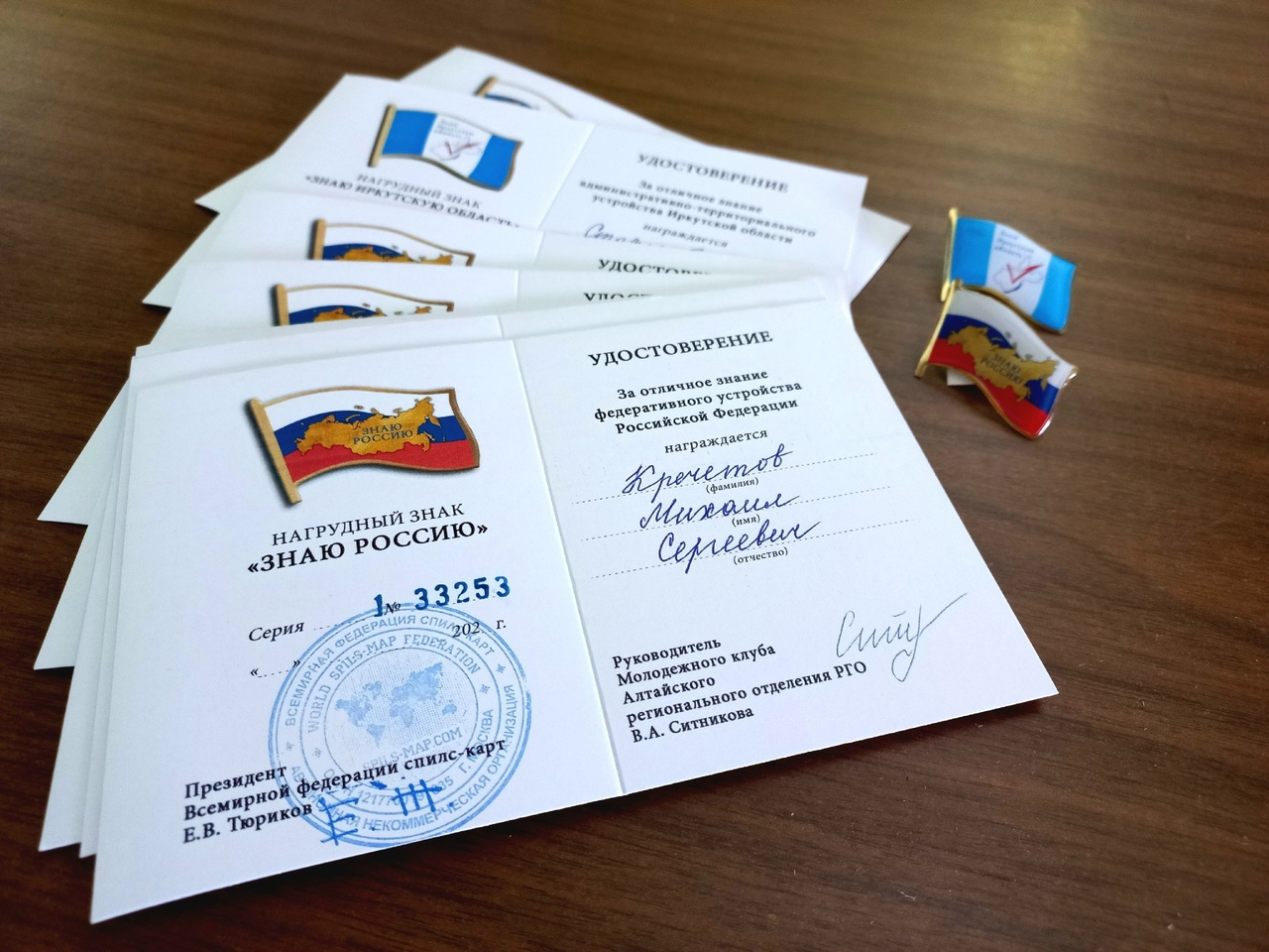 Участникам Чемпионата, получившим в индивидуальном зачете Сертификат, подтверждающий контрольное время сборки спилс-карты, были вручены удостоверения и значки "Знаю Россию" и "Знаю Иркутскую область". Всего на заседании было награждено 10 участников Чемпионата среди школьников и студентов. Участникам, которые не смогли присутствовать на заседании ИОО РГО, значок и удостоверение будут вручены в индивидуальном порядке.