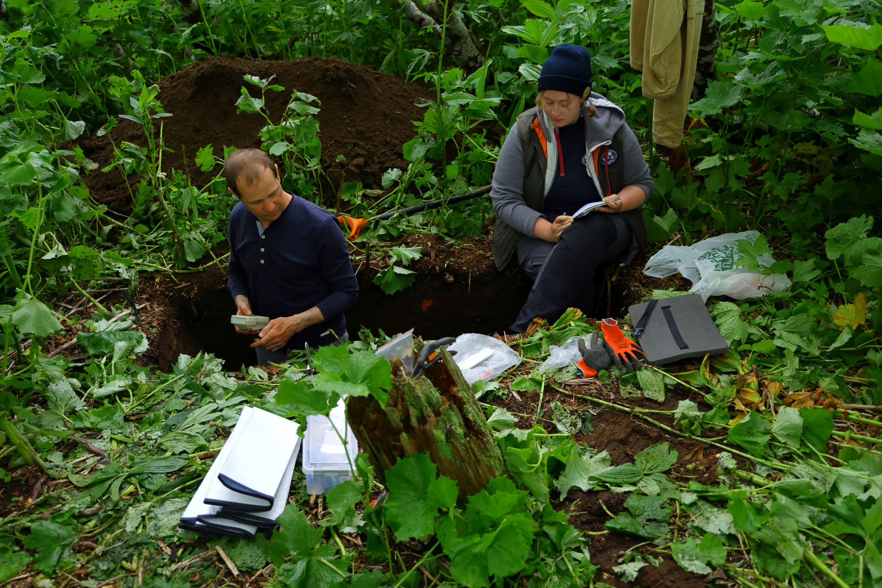 Марина: Онекотан необитаем, но он хранит в себе следы присутствия и японцев, и русских пограничников, и лис. Мы, геоморфологи, почвоведы, геологи, гидрометеорологи, зоологи, геоботаники и вулканологи занимались исследованиями южного Тихоокеанского побережья и центральной части острова. В мои задачи входило исследование биологической активности и органического вещества верхнего горизонта почв, а также описание и диагностика вулканических погребённых почв совместно со старожилом экспедиции, научным сотрудником Почвенного института имени В.В.Докучаева, Сергеем Фёдоровичем Хохловым. Из интересных почвенных артефактах нам встретилась посуда, осколки стекла, медный кабель на глубине ниже 53 см.