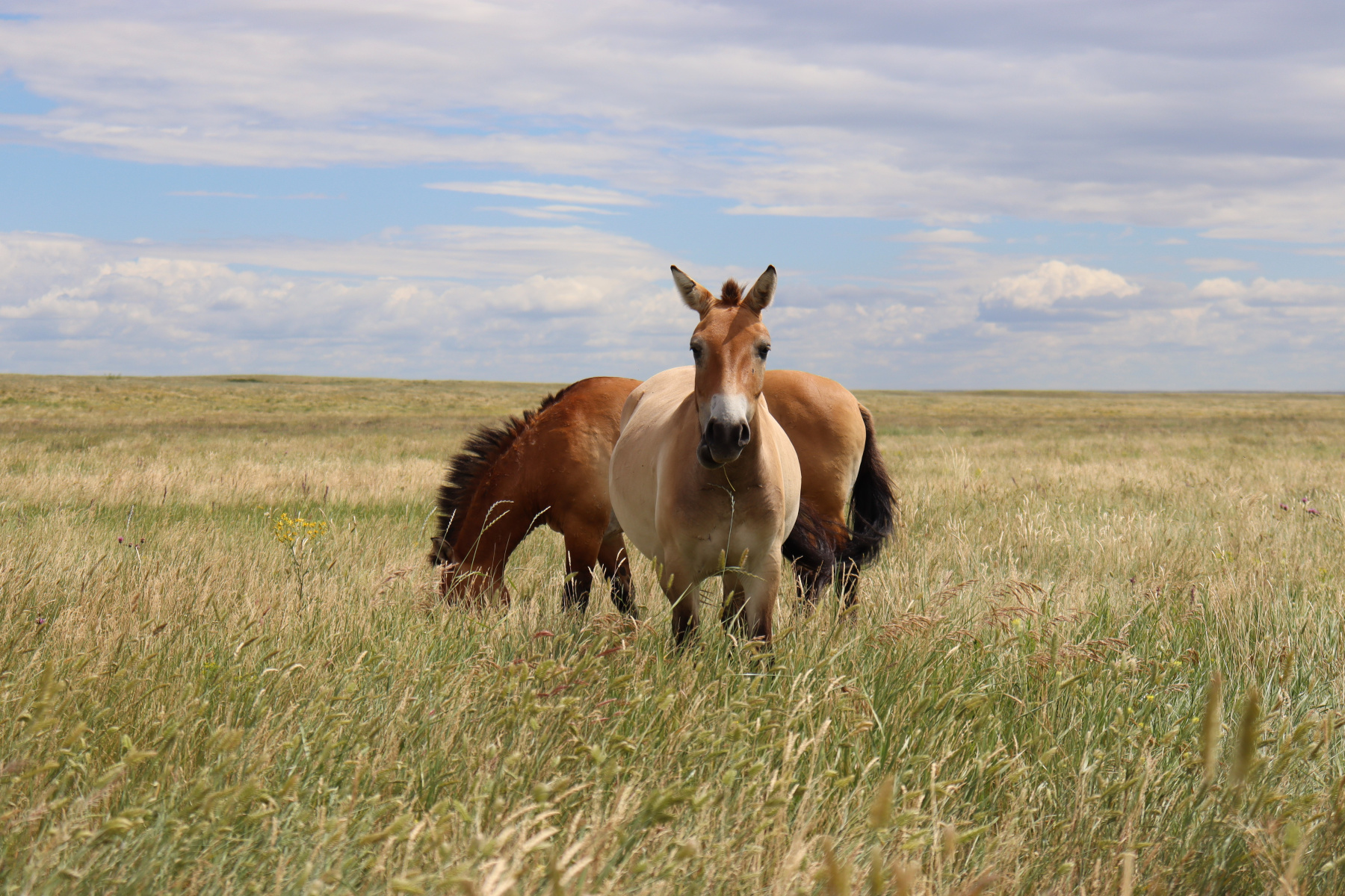 Высоко в небе парит орел. Из травы доносится голосок пищухи. По светло-зеленой глади рассыпаны желтые, белые, синие, фиолетовые капли красок: подмаренник, шалфей, другие полевые цветы. В Оренбургском заповеднике начинается новый день. Весь заповедник поделен на 5 участков, мы находимся на участке "Предуральская степь". Именно здесь в 2015 году был создан первый и пока единственный в России центр реинтродукции лошади Пржевальского – последней сохранившейся дикой лошади на планете.