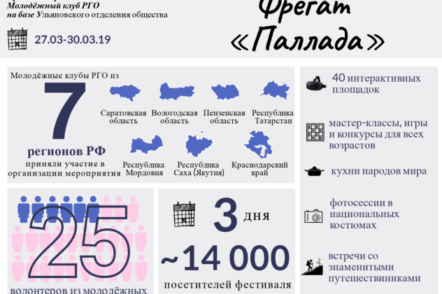 Географический фестиваль «Фрегат «Паллада» организован Ульяновским областным отделением РГО и ульяновским отделением Российского Союза молодежи при финансовой и организационной поддержке Правительства Ульяновской области.