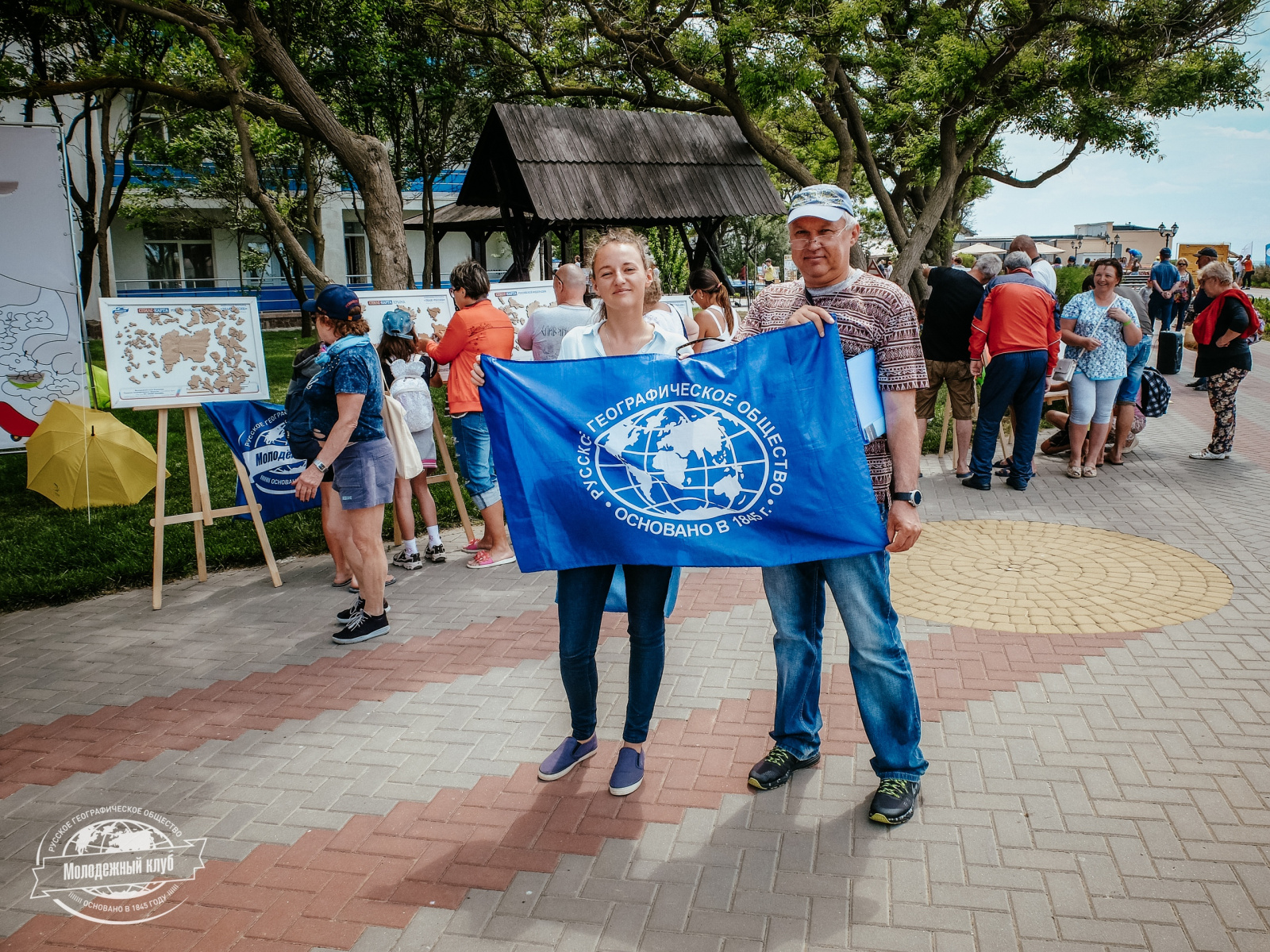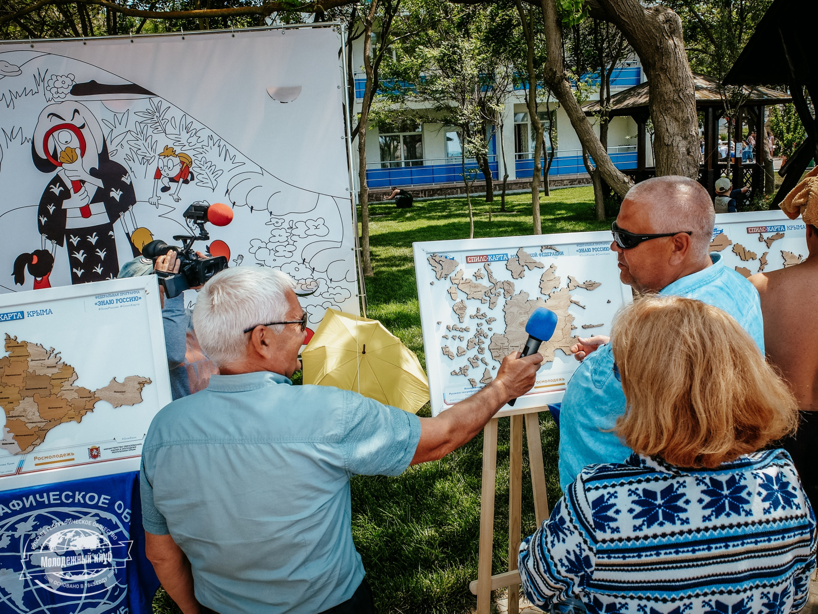 В Саках прошёл III фестиваль водных видов спорта «Жёлтый батискаф». Руководитель Молодёжного клуба Крымского отделения РГО Александра Никифорова и активист Евгений Большов организовали географическую площадку, где любой желающий мог проверить свои знания в географии России и Крыма, собрав спилс-карты.