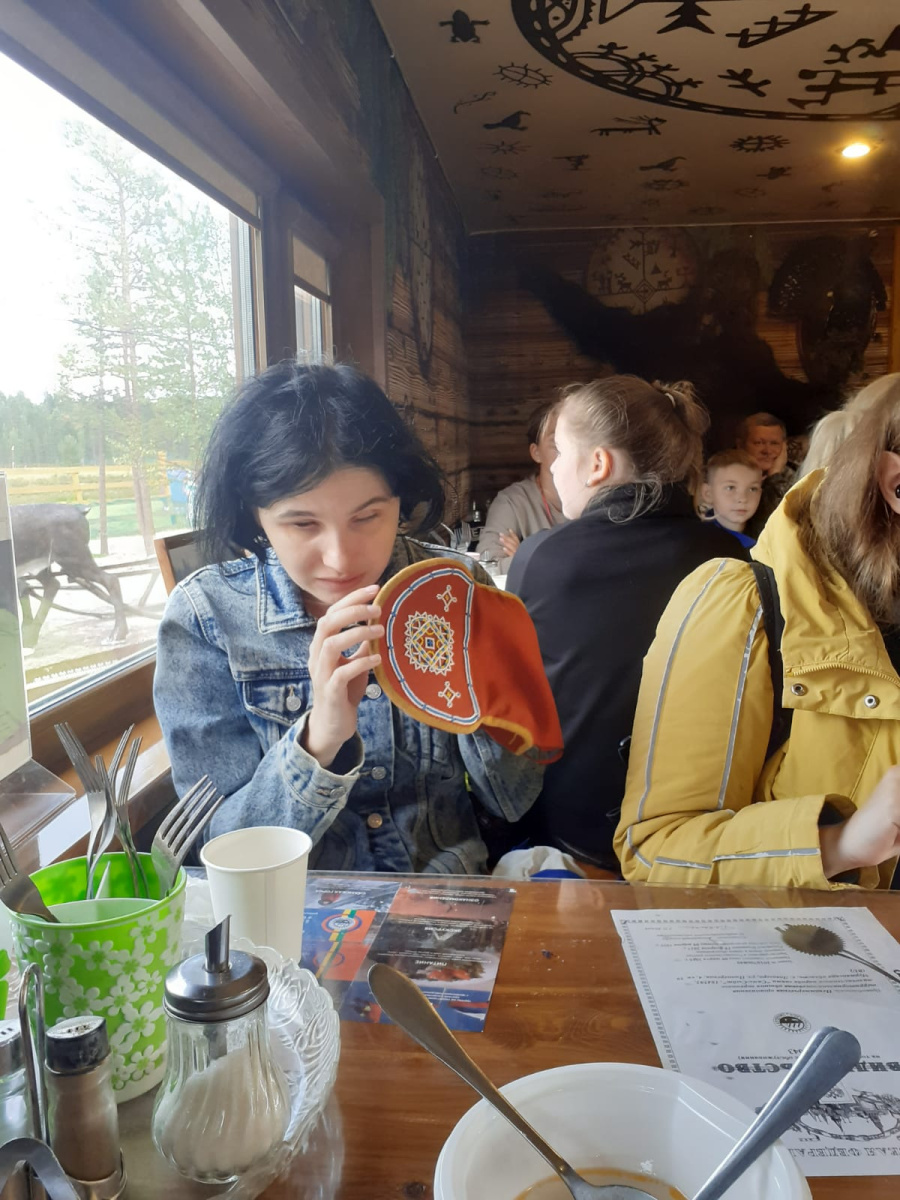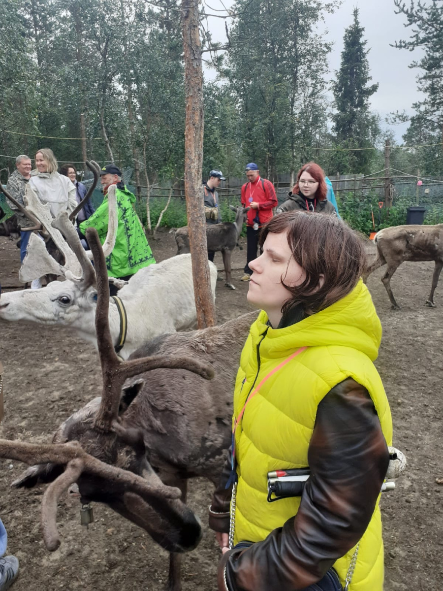 Тундра позади. Впереди – краеведческое погружение. Присоединяемся к большой группе. Саамское приветствие звучит необычно и загадочно. Не теряя времени, идём к оленям. Ни один саамский оленевод никогда и никому не расскажет, сколько оленей у него в стаде. Вокруг нас хвойное редколесье. Тут и там низкие кривые берёзы. Необъяснимым горловым звуком хозяин кличет оленей из тундры. Издалека раздаётся звук колокольчиков и один за другим из леса появляются невысокие животные. Их головы увенчаны роскошными молодыми рогами, которые ещё не успели окостенеть и потому похожи на бархатные. После знакомства с оленями наступает время саамских историй. Саамы – малочисленный коренной народ Кольского полуострова. Их жизнь самым тесным образом связана с оленями, о чём нам и поведал местный проводник, держа в руках расшитый бисером женский головной убор красного цвета, шапочку-шамшуру. Её можно считать паспортом обладательницы. Передав шамшуру в руки незрячим гостям, хозяин последовательно раскрывал значение каждого вышитого символа. Вот и вышло, что принадлежит она замужней женщине, а значит, нет смысла приводить к её отцу своих оленей, чтобы похвастаться богатством.