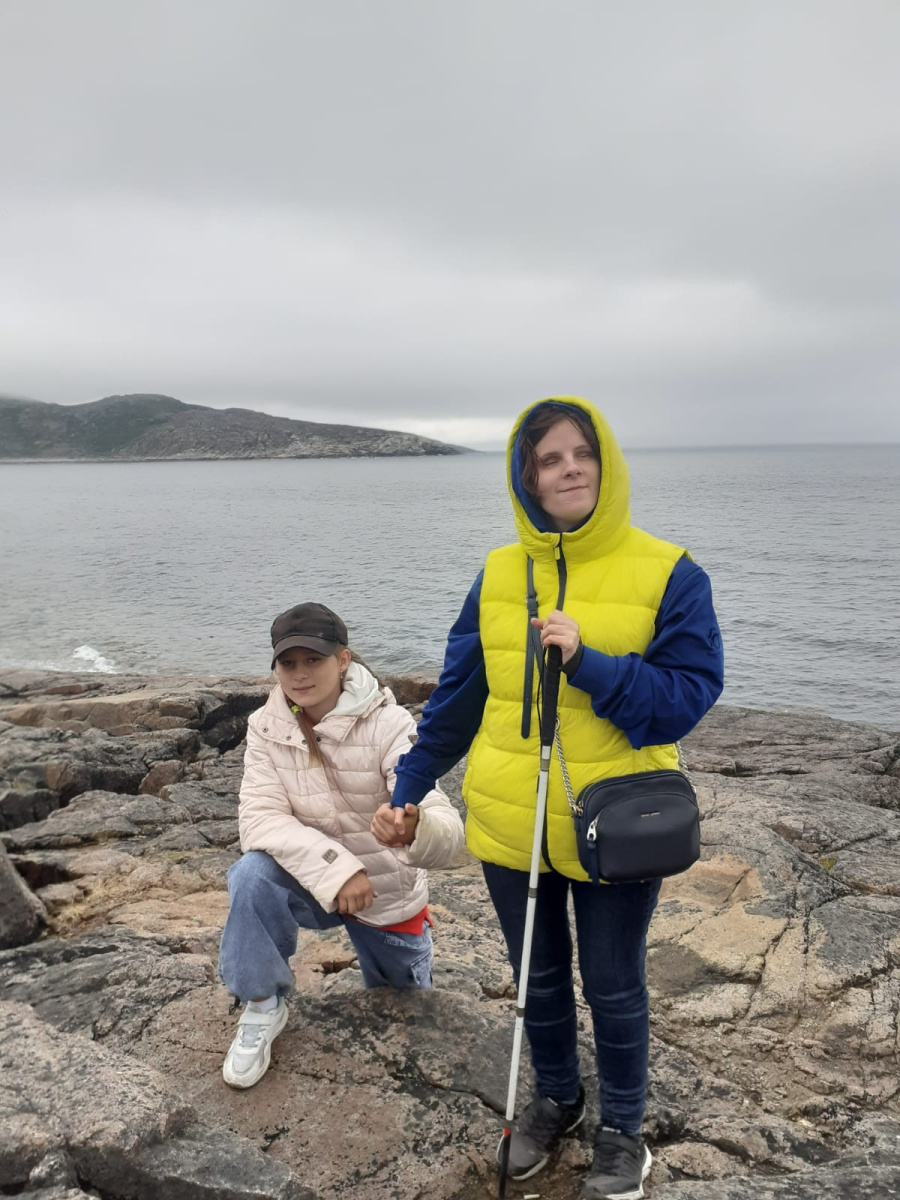 Самые старшие участники экспедиции Светлана и Андрей Недбайловы - чемпионы Всероссийских чемпионатов по интеллектуальной игре "Что? Где? Когда?" Всероссийского общества слепых. В прошлом, до потери зрения, Андрей был профессиональным альпинистом и спелеологом, участвовал в открытии Санболинской пещеры, знаменитой своими цветными льдами. Супруги оценивали сложность трекингового маршрута от пляжа Яйца Дракона до Батарейского водопада. Гладкие валуны пляжа, на которых сложно обрести устойчивость, сменились на простую, но длинную экотропу. Несмотря на перепад высоты и подъём в горку, все благополучно добрались до водопада. К этому времени на Териберку начал наползать туман, превращая её в самое загадочное место на земле, которое когда-либо видела наша инклюзивная команда.
