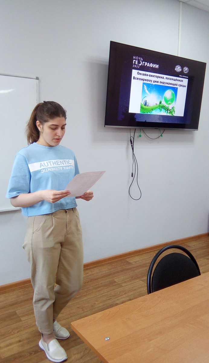Активистами молодежного клуба Тамбовского областного отделения Русского географического общества 5 июня в 19.00 проведена викторина в онлайн-формате. Мероприятие в рамках мероприятий РГО «Ночь географии» посвящено Всемирному дню окружающей среды, который ежегодно глобально отмечается во многих странах мира. В викторине принимали участие около 200 человек. Как всегда, это люди разных возрастов (в большинстве своем школьники, студенты, военнослужащие в/ч 77977) из разных регионов. География участников: Тамбов, Тамбовская область, Энгельс, Воронеж, Санкт-Петербург, Челябинск, Оренбург и другие города. Всего в викторине было 20 вопросов разного уровня сложности. Очный старт викторине был дан в ТГУ имени Г.Р. Державина председателем Тамбовского областного отделения РГО Инякиной Еленой Евгеньевной и заведующим кафедрой экологии и природопользования университета Завершинским Александром Николаевичем, участники очного старта - студенты направления подготовки «География», «Экология».
