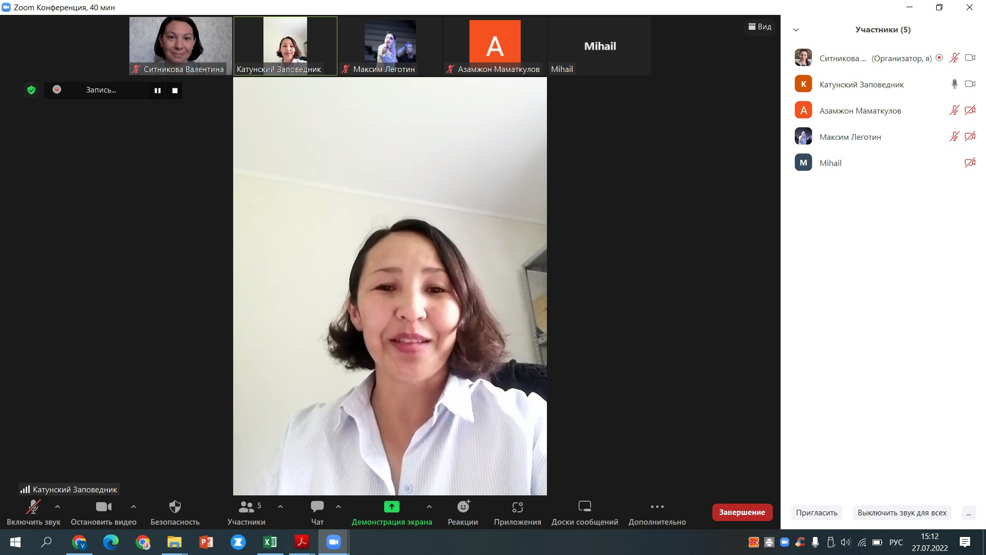 Для предварительного знакомства с программой и основными пунктами проекта было проведено онлайн-совещание с участниками и организаторами. Встреча состоялась 27 июля в ней участвовало 6 человек. На встрече участники познакомились с заместителем директора по экологическому просвещению Анной Тадиевной Маймановой. Она рассказала о маршруте проекта, о том месте, где будет базовый лагерь участников - Мультинский участок заповедника. Кратко познакомила с Катунским биосферным заповедником и с работами, которые будут осуществлять добровольцы во время экошколы.