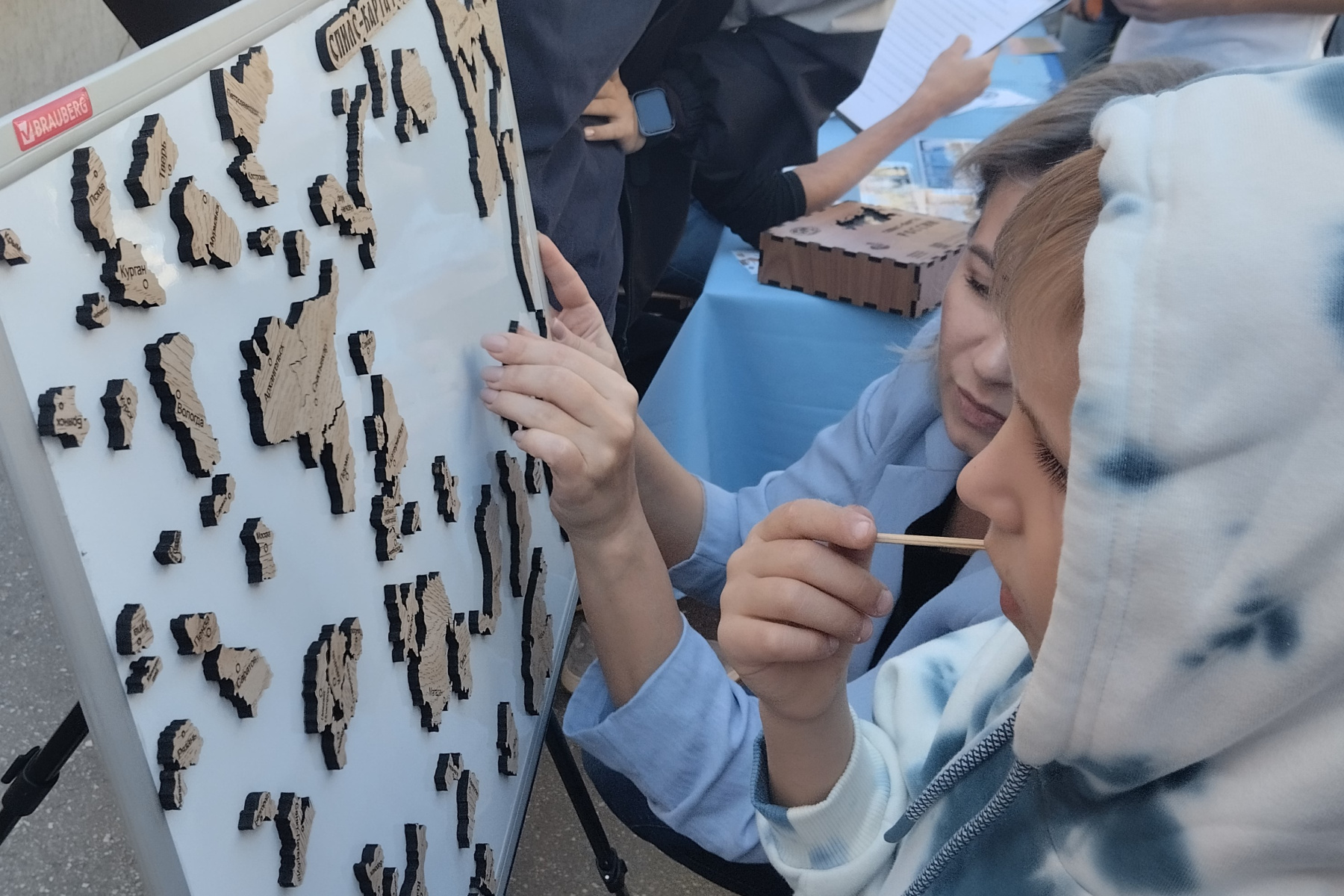 Дети и взрослые с азартом собирали спилс-карту России: одни проверяли свои знания о регионах, другие открывали для себя их точное расположение. Географическая викторина собирала целые компании участников и превращалась в дружеское соревнование. Уникальная коллекция песка из разных уголков мира произвела настоящий фурор: ребята рассматривали яркие образцы и делали из них открытки на мастер-классе в виде памятных сувениров фестиваля.