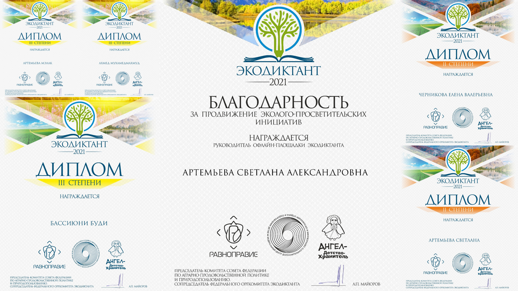 Экологический диктант - ежегодная акция, направленная на формирование экологической культуры, популяризацию экологических знаний и повышение уровня экологической грамотности. Организаторами Экодиктанта являются АНО «Равноправие», ООД «Ангел-ДетствоХранитель» и «Федеральный центр дополнительного образования и организации отдыха и оздоровления детей».