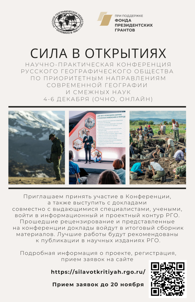 Первая научно-практическая конференция "Сила в открытиях" по приоритетным направлениям географии и смежных наук состоится 4–6 декабря 2023 года. Подать заявку на участие в конференции "Сила в открытиях" возможно до 20 ноября.