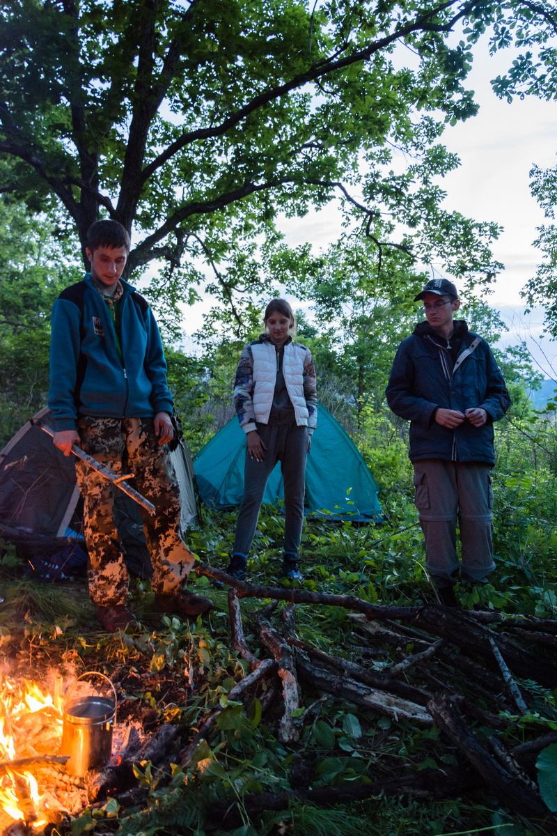 В первый день путешествия активисты Молодежного клуба РГО познакомились с особенностями походного быта: научились разбивать палаточный лагерь в диком лесу, правильно заготавливать дрова для костра, готовить ужин на огне.