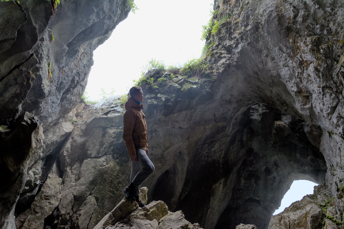 Забравшись на высоту 550 метров над уровнем моря, группа попала к пещере Сквозной. Этот грот образовался в скальном выходе, благодаря процессам морозного выветривания, разрушавшим основание узкого высокого скального гребня одновременно с двух противоположных сторон. Геофизические процессы "прорыли" в породе сквозной проход глубиной около 30 метров.