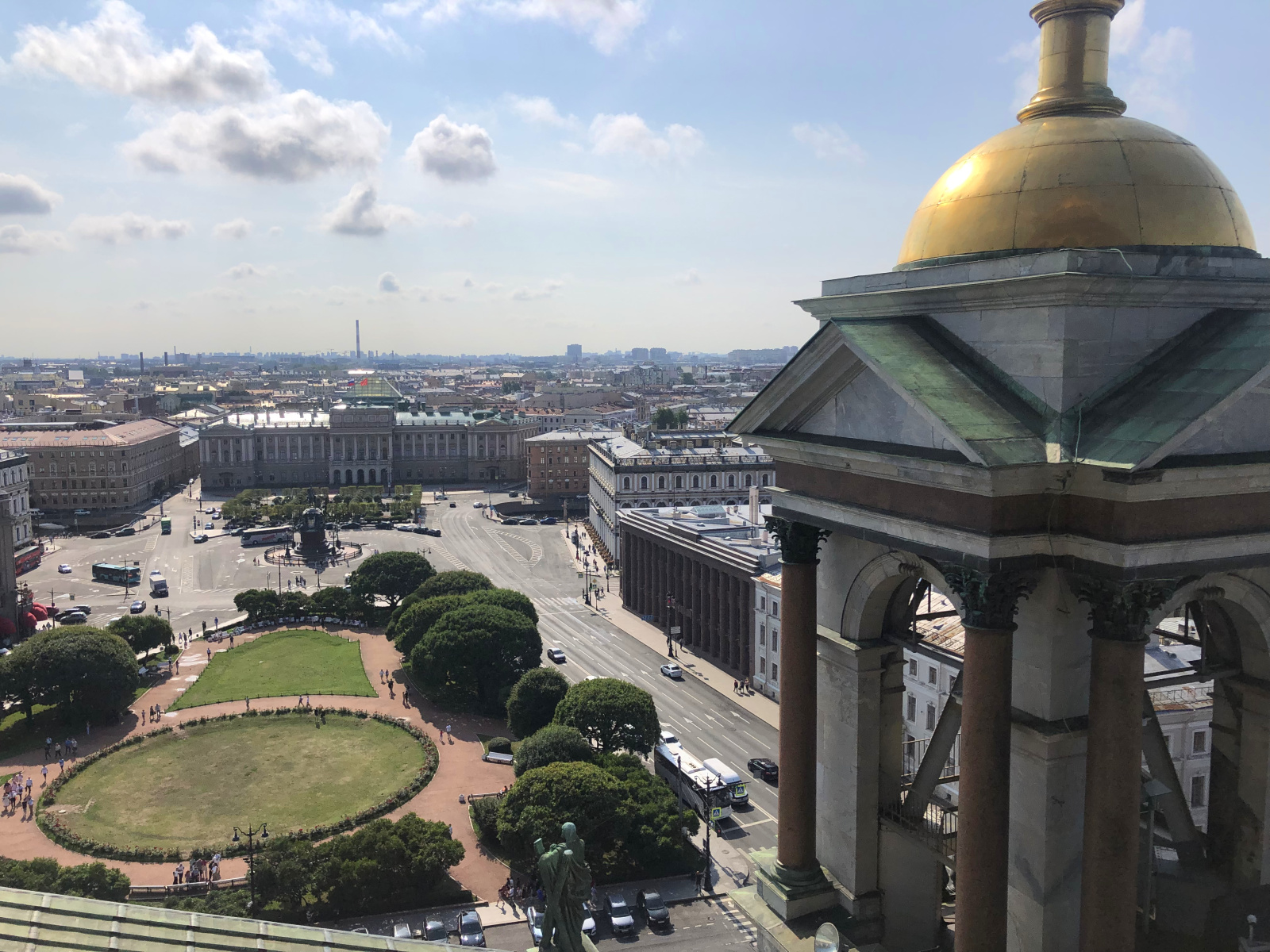 Обязательно поднимитесь на смотровую площадку над колоннадой собора, чтобы полюбоваться панорамой города с высоты 101 метра. Виды восхитительные: оттуда просматривается Нева, здания Петровских коллегий, площади перед собором и сотни разноцветных петербургских крыш.