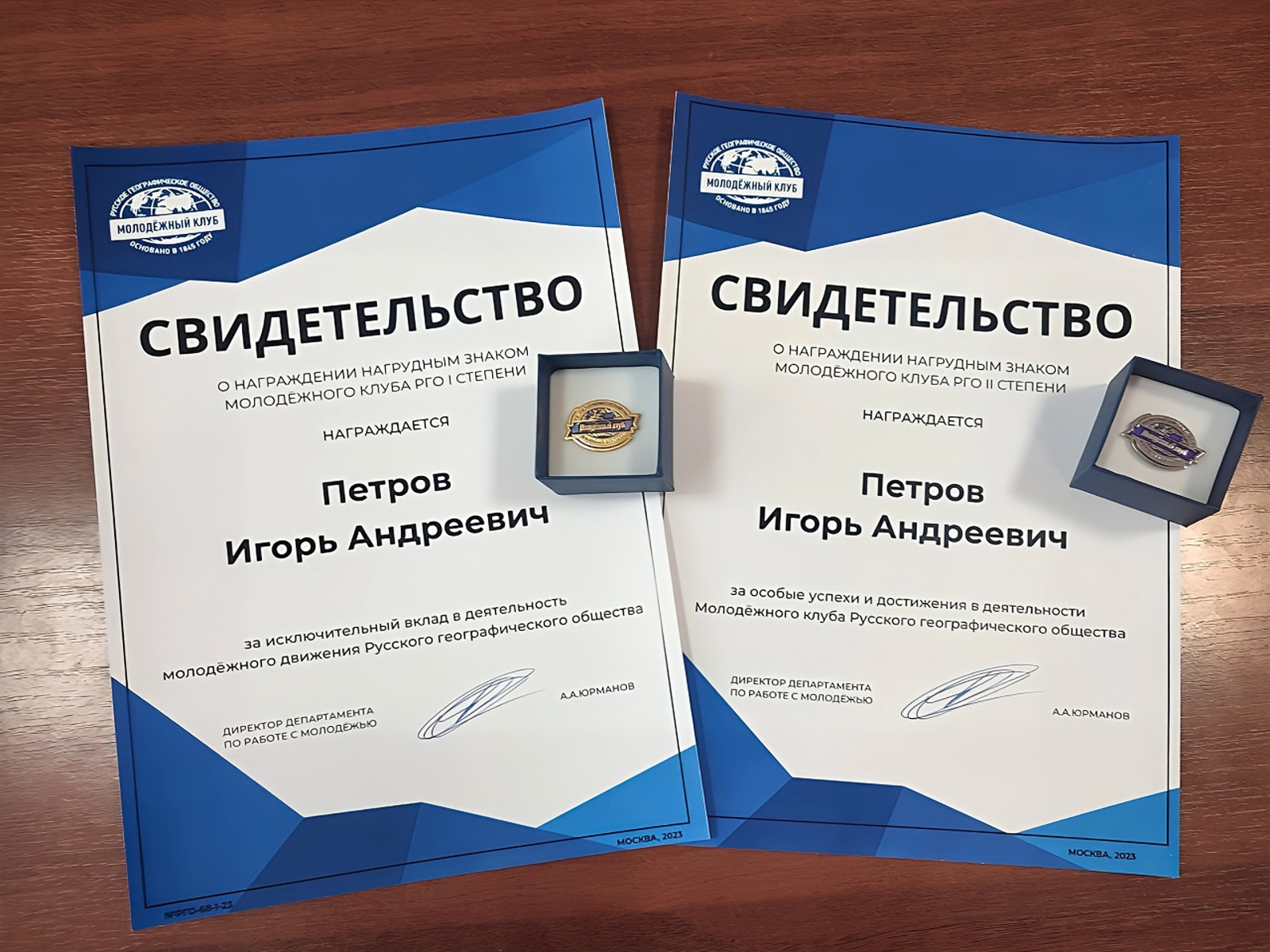 Руководителям и активистам клубов регионов России были присвоены более 50 золотых и более 200 серебряных нагрудных знаков Молодежного клуба РГО со свидетельствами о награждении за подписью Директора Департамента по работе с молодежью ИД РГО. Петров Игорь, руководитель молодежного клуба Тамбовского областного отделения РГО награжден двумя нагрудными знаками – I и II степени.