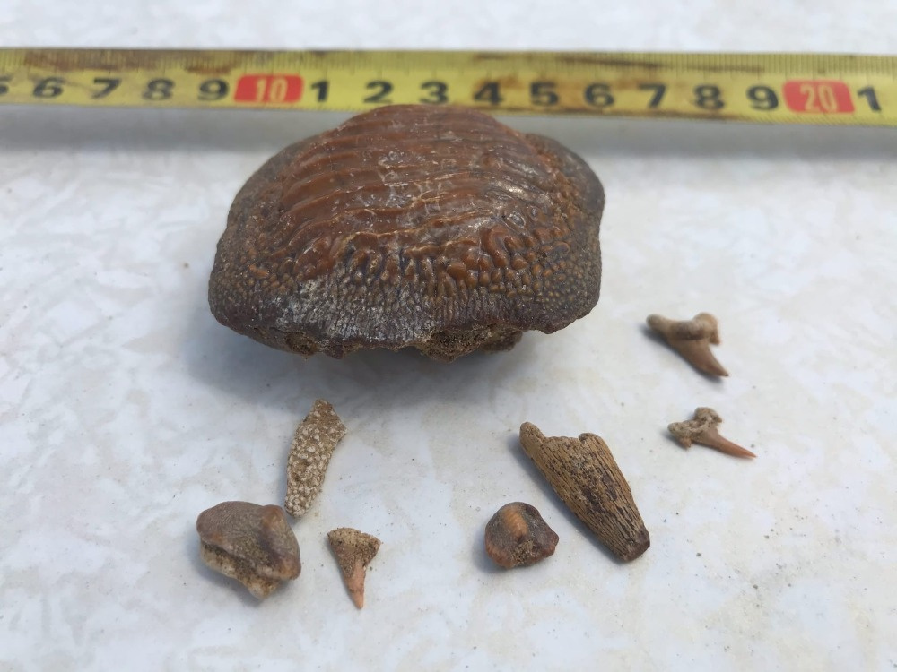 В ходе раскопок был обнаружен гигантский зуб акулы птиходуса (лат. Ptychodus).