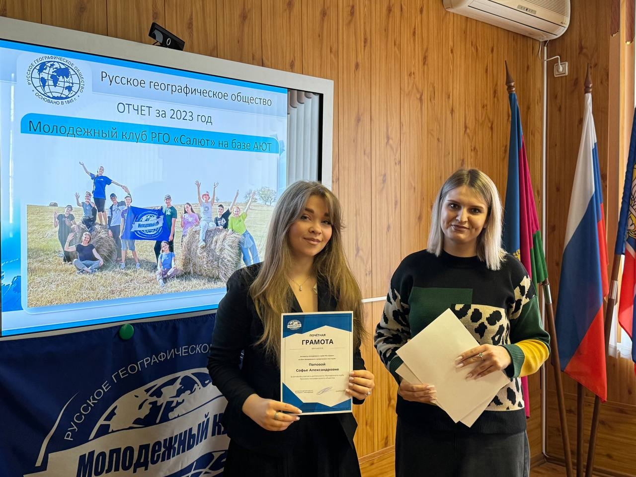 Почётными грамотами Департамента по работе с молодежью Русского географического общества за активное участие в деятельности Молодежного клуба РГО в 2023 году были награждены Софья Попова и Анна Титова.